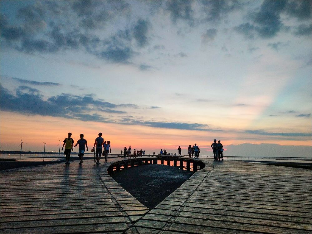 ▲ 【高美濕地】位於清水大甲溪出海口南側,擁有豐富的生態及景觀資源,橘紅色的夕陽及巨大的風車更是不可錯過的美麗景致。當地居民曾為了觀光發展與生態保育而拒絕外地遊客到訪,在台中市政府鋪設景觀木棧道後終於找到了平衡點,亦實現「把遊客留在棧道上,濕地留給潮間帶生物」的生態保育理念。