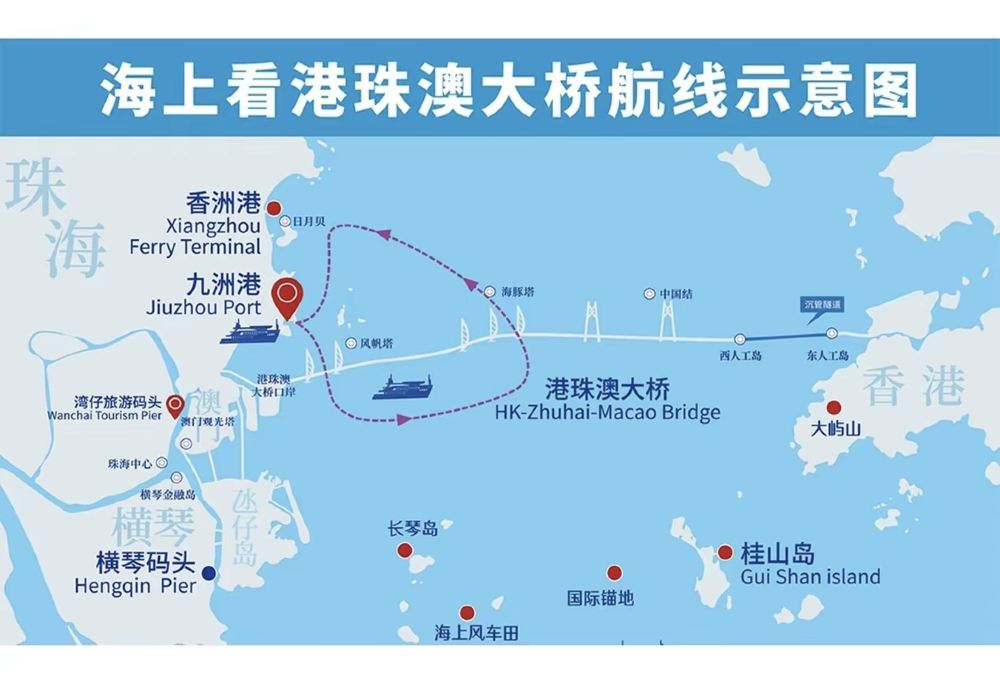 感謝選擇九洲港海上觀光項目。受潮汐影響,7月24日-27日海上看港珠澳大橋的16:10班不經過風帆塔。因天氣、船舶調度等影響,本航線或暫時調整航班或停航。具體將會提前通知。