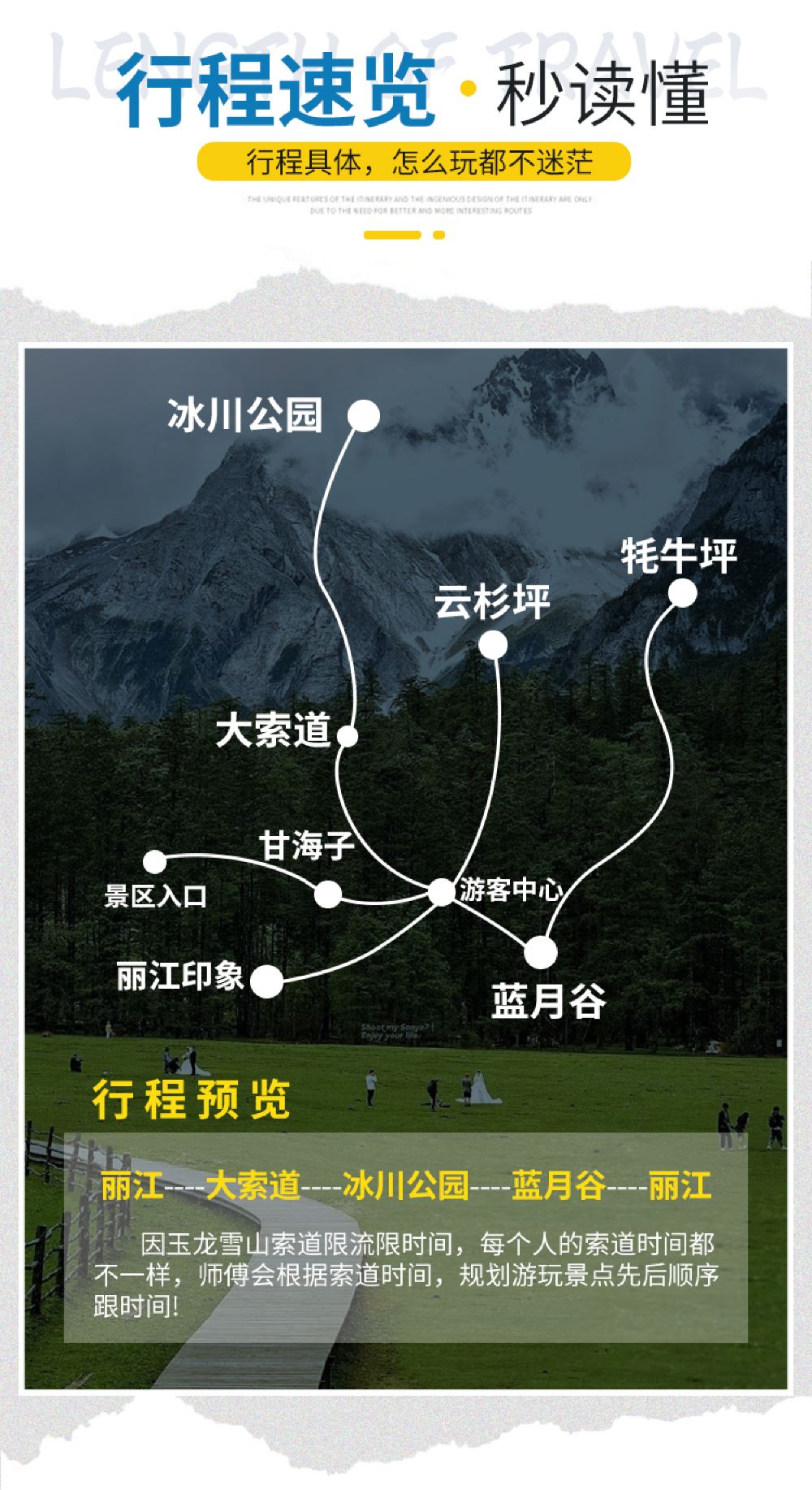 4、麗江古城及束河古鎮一圈的馬路邊接送,超出指定範圍,請自行前往上車點,行程時間僅為預估參考時間,具體遊玩順序、時間在不減少遊玩景點的情況下,需要根據索道時間段進行合理調整。