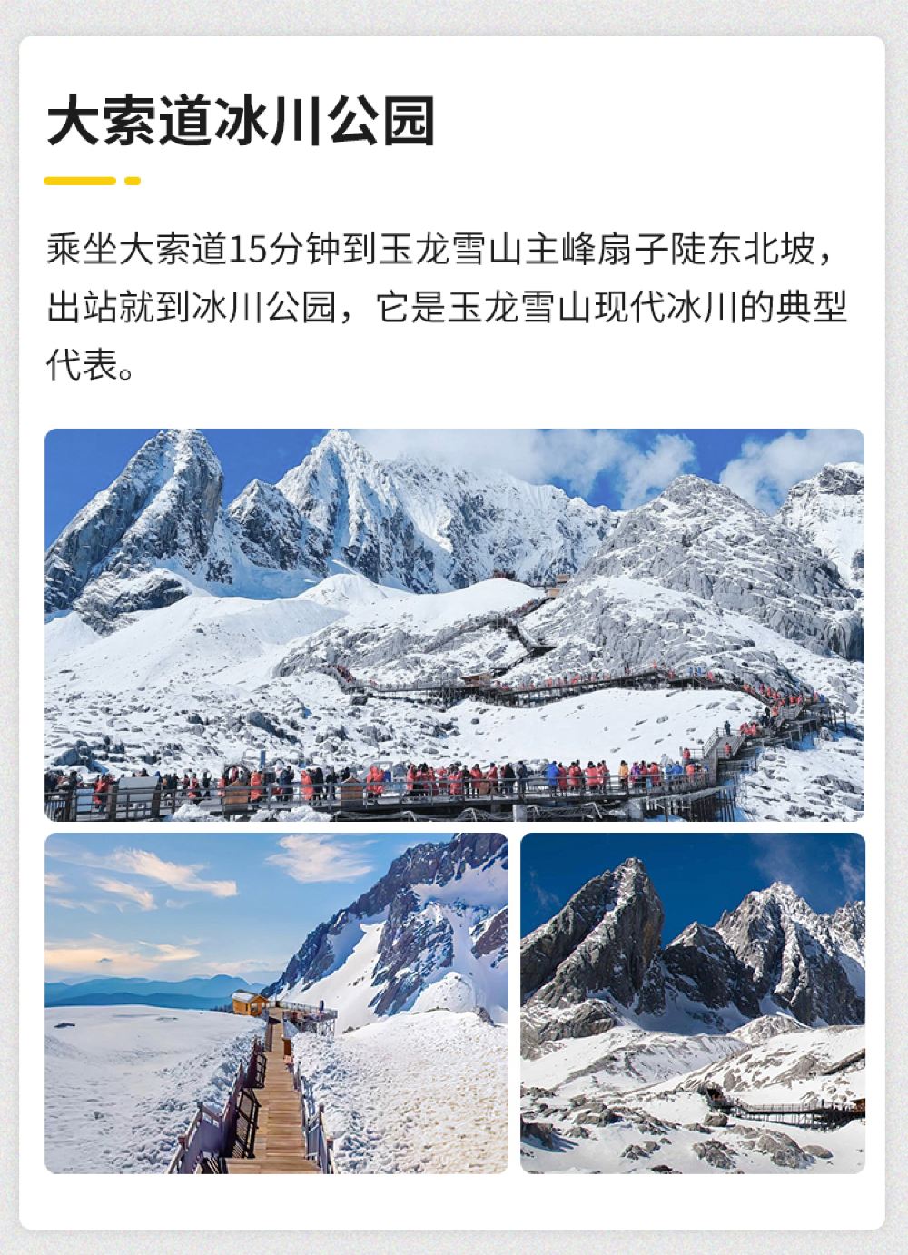 玉龍雪山 入內參觀 含門票 無需預約 遊玩項目冰川公園索道,遊玩項目景區環保大巴車(園內來回交通),遊玩項目雲杉坪索道,服務配套雪山三寶:800ml氧氣樽、防寒衫、礦泉水