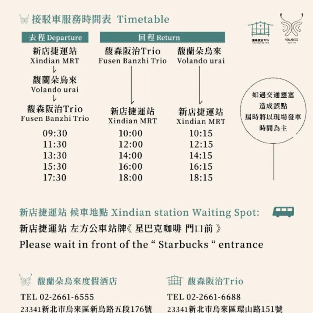 - 接駁車服務每位需酌收新台幣$50/趟。因座位有限,請欲搭車的貴賓事先預約,並於發車前10分鐘請至乘車處候車
