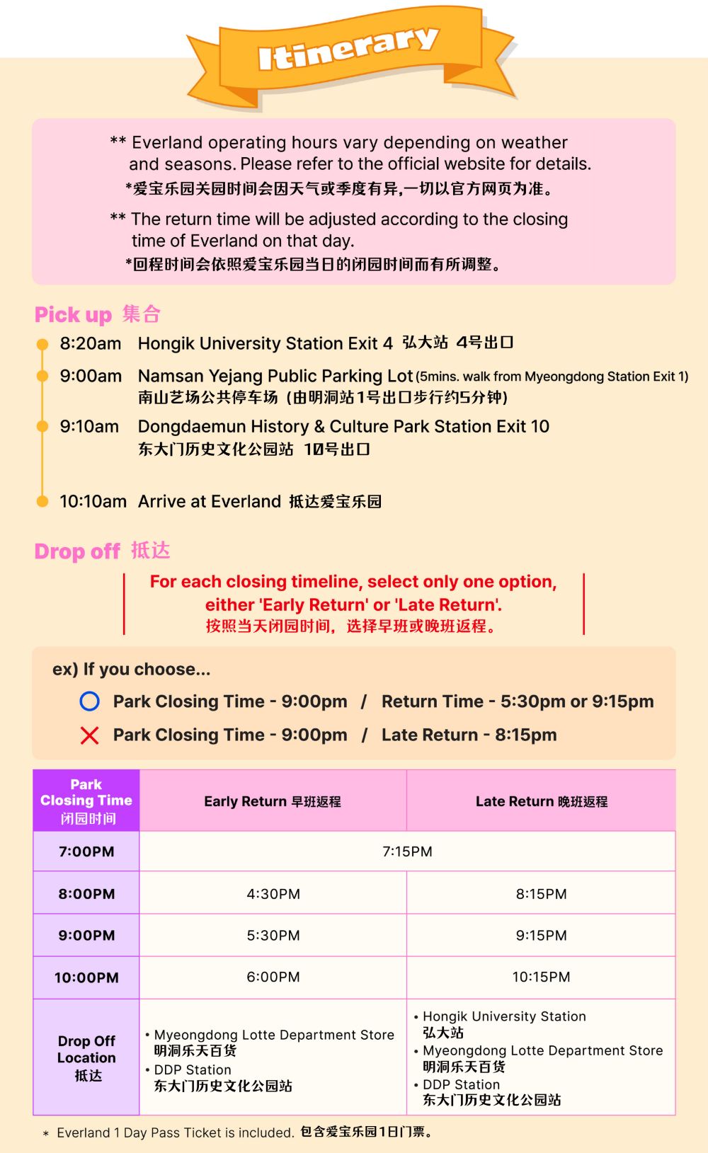 21:15 首爾 東大門歷史文化公園站 解散 回程時間會依照愛寶樂園當日的閉園時間調整 * 愛寶樂園關園時間會因天氣或季度有異,一切以官方網頁為準* 1) 7點閉園時:19:15 返回首爾 2) 8點閉園時:第一班: 16:30 返回首爾 / 第二班: 20:15 返回首爾 3) 9點閉園時:第一班:17:30 返回首爾 / 第二班: 21:15 返回首爾 4) 10點閉園時:第一班:18:00 返回首爾 / 第二班: 22:15 返回首爾