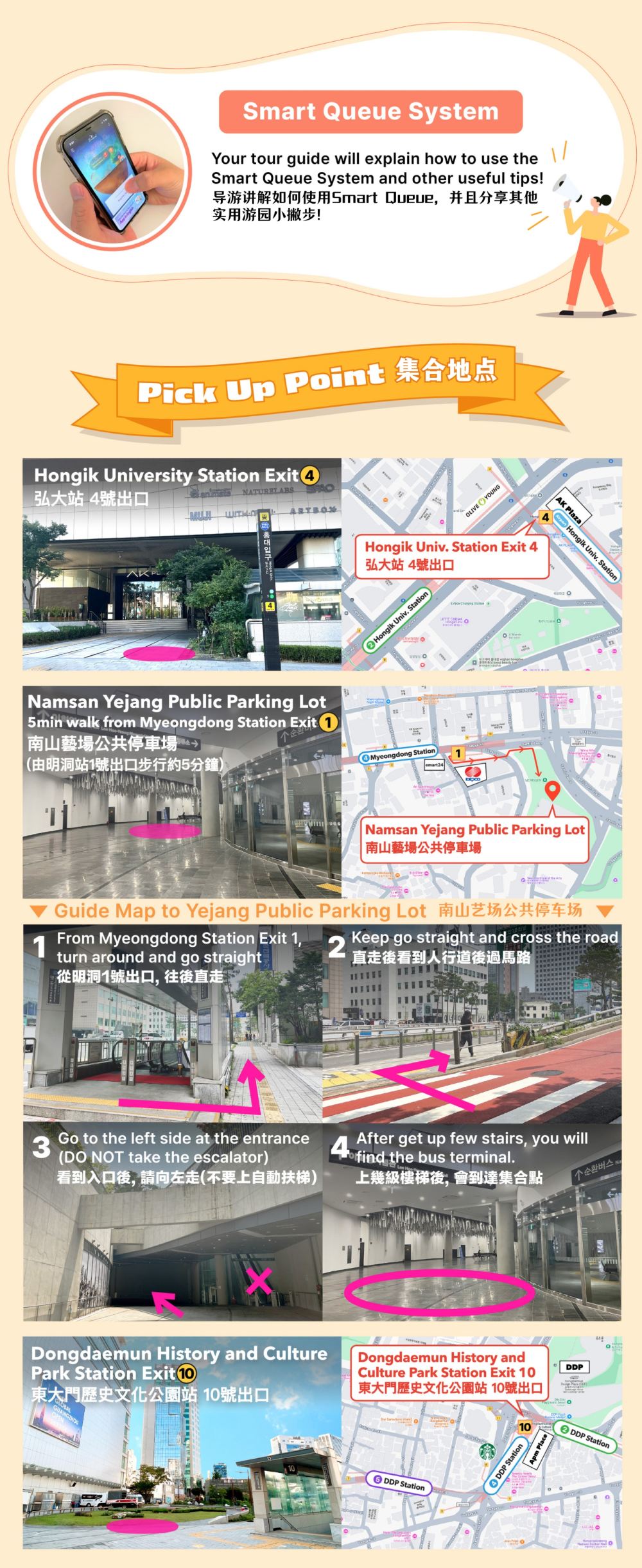 由明洞站1號出口到停車場步行大約需時5-7分鐘,建議提早15分鐘抵達明洞站後行過去。在集合地點集合