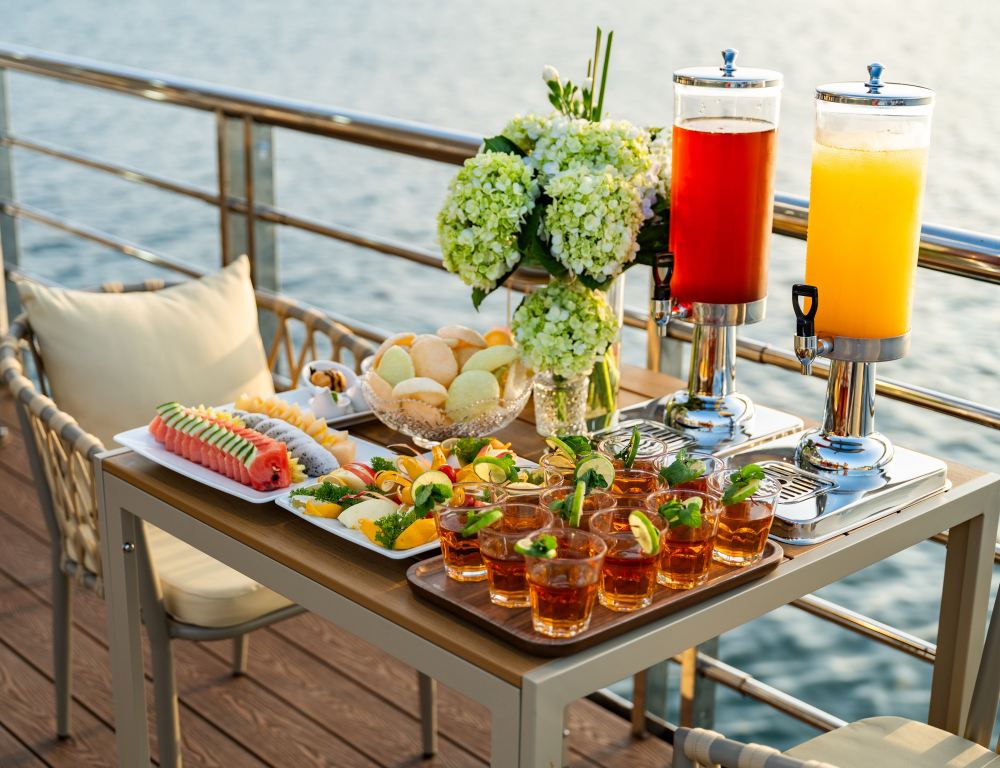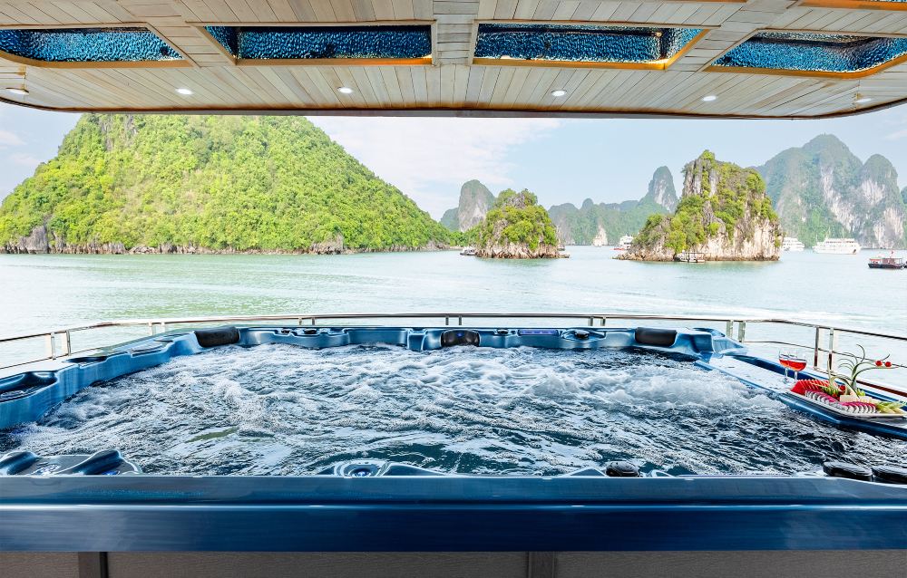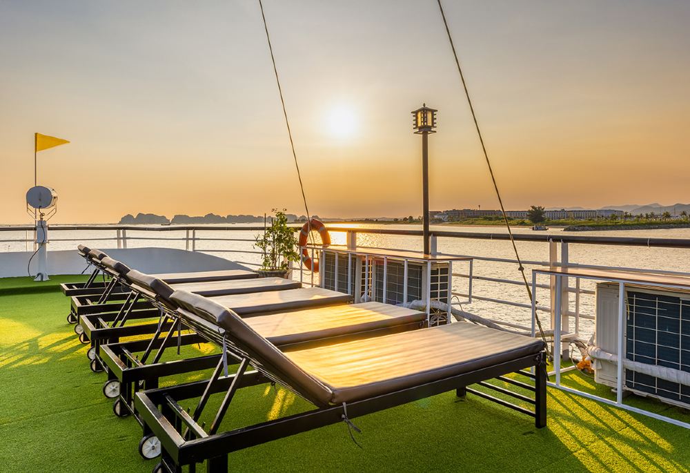 當夕陽西下,天空染上深紅、紫與金黃時,享受免費葡萄酒、越南茶和新鮮水果。放鬆身心,欣賞美景,乘船返回港口。