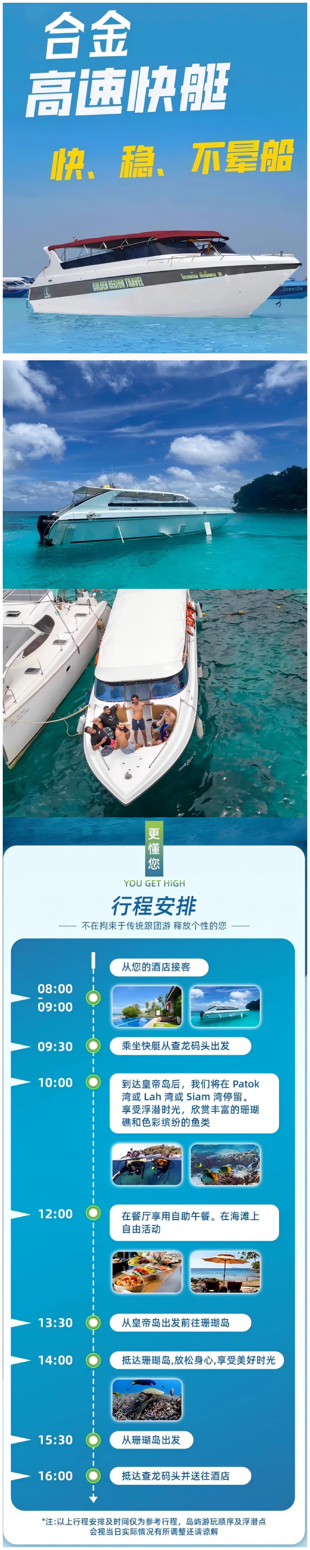 於指定地點接載08:00 布吉 於指定地點接載 指定區域內接送(芭東、卡塔、卡倫) 集合時間地點僅供參考,具體請以實際的確認單為準 以下請務必仔細看~ 【關於出行】孕婦、心臟病不可報名,出行前不會提前通知,時間按照確認單上面的時間提前5分鐘前往等待即可,車最多只等待5分鐘,超時需要自行打車前往碼頭 【車輛遲到】因為布吉車況複雜,如果遇到堵車、車禍、車上客人身體不適等等不可抗因素導致車輛遲到,請耐心等待不作為脫俗的理由!請諒解 謝謝!