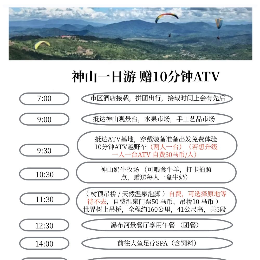 C-神山+滑翔傘+贈10分鐘atv | 待確認車輛 | 國語 | 提供去程接送 | 拼團 | 16位旅客 | 普通導遊 | 包括午餐 | 回程接送