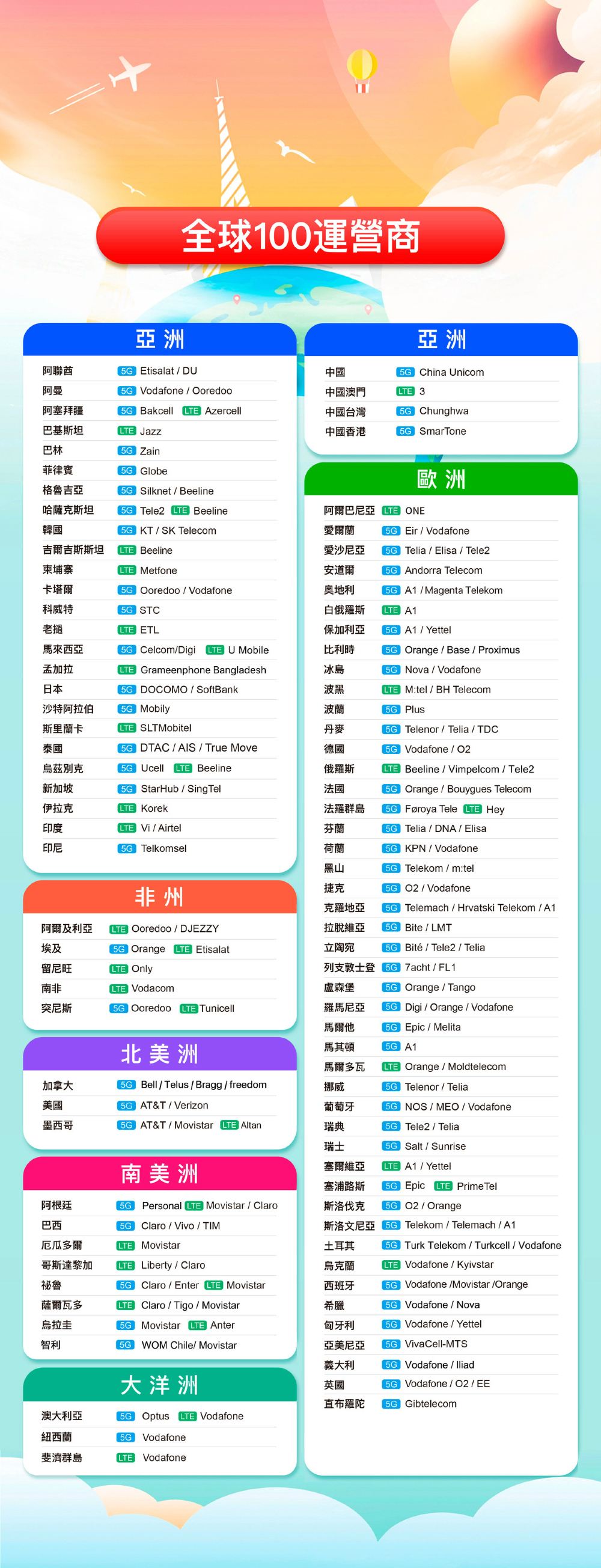 全球通用(100國)4G/5G eSIM | 日用包/總量包 | 500MB/日-總量30GB | 1-30天 | 24H計費 | QR code