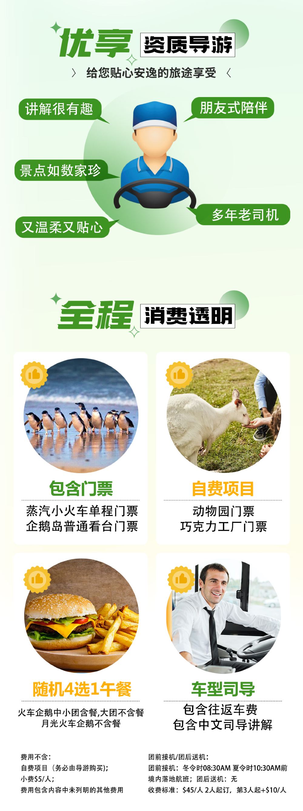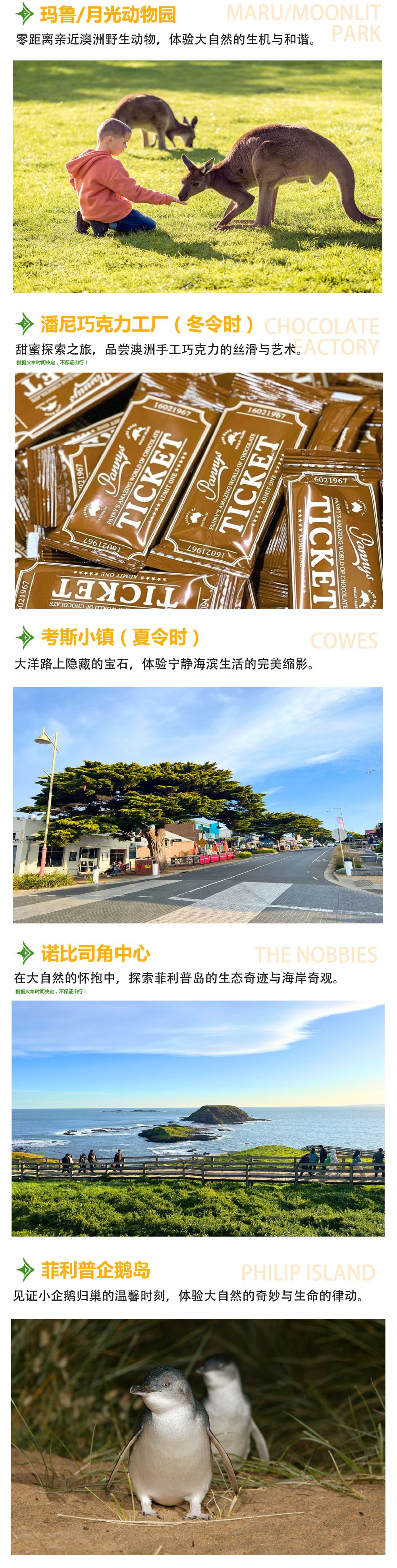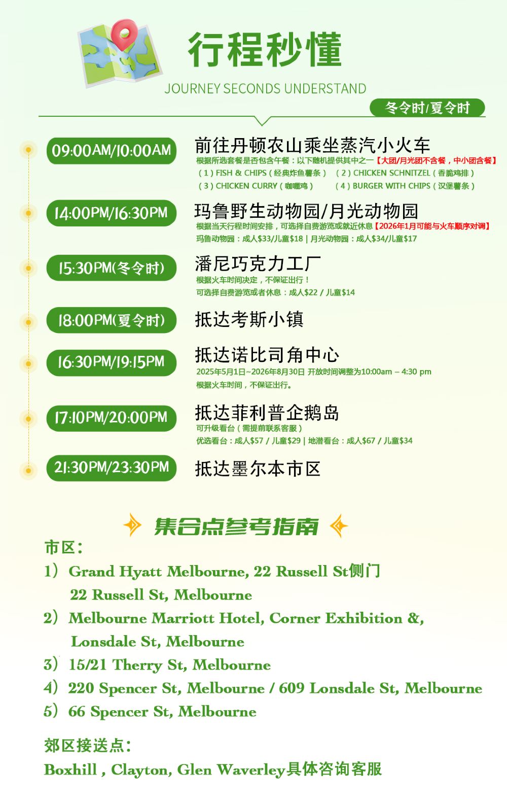 21:30 於墨爾本下車 指定區域以外不提供接送服務 【冬季時間(5月-9月)】09:30-21:00 【夏季時間(10月-次年4月)】12:00-23:30 *時間僅供參考!具體時間以短信通知為準! *市區大部分酒店提供上門接送服務,40人團於上述固定集合地點上車。小團提供市區郵編3000部分酒店接送,或就近接送。 *下單時請務必提供您的詳細酒店資料,以便地接確認是否在免費接送範圍內;若超出範圍,請前往最近的上/下車地點等候上車。