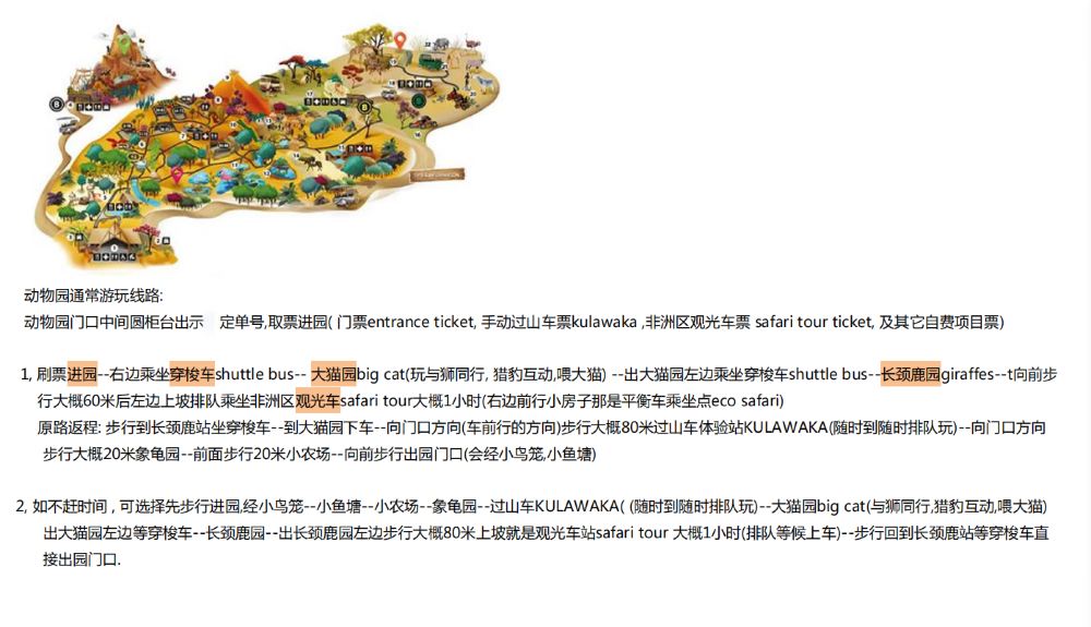 動物園門票包含: 觀光車(可觀看斑馬、鴕鳥、白犀牛、黑斑羚、羚羊、捻角羚等) 參觀鳥園 參觀長頸鹿園 駱駝 參觀小農場、象龜園、大貓園 一次TULAWAKA吐拉瓦卡過山車體驗