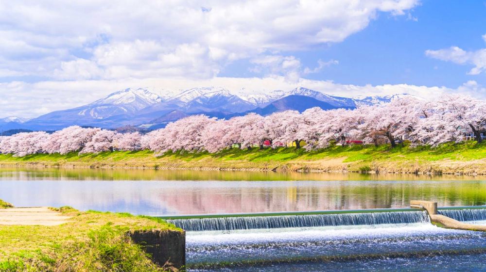 日本著名的賞櫻勝地之一,曾入選日本「賞櫻名所百選」。以清澈的白石川和白雪皚皚的藏王連峯為背景,圍繞中心的吉野櫻盛放著約1200株櫻花樹。湛藍天空倒映在澄澈的白石川水面上,漫山遍野的櫻花綻放著絢麗的粉色,背後是白雪覆蓋的高山,堪稱視覺盛宴!
