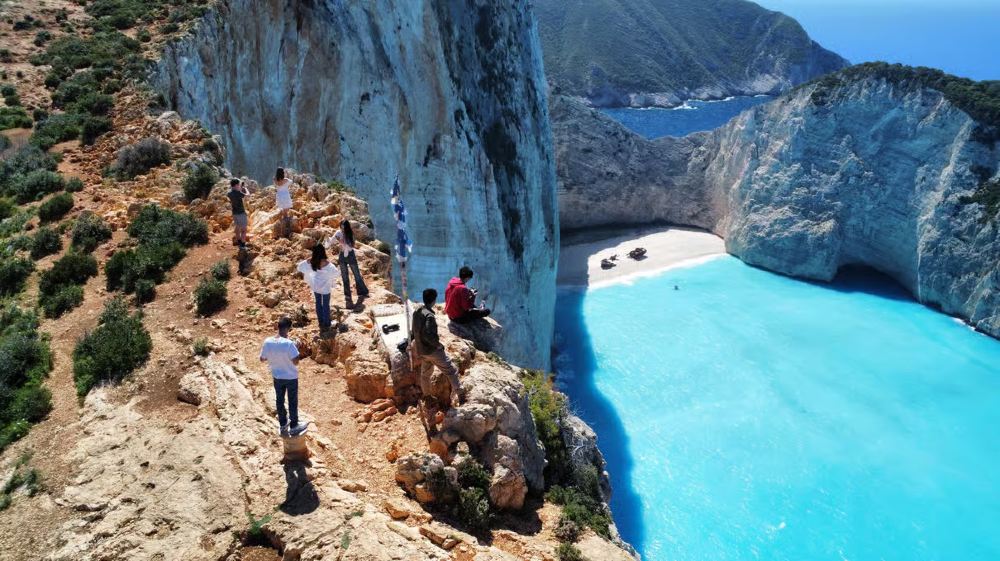 可以從山頂欣賞清澈的海水、陡峭的石灰岩地層以及白色沙灘中央一艘生鏽的舊船,沉浸在壯麗的藍色海水和天空交通