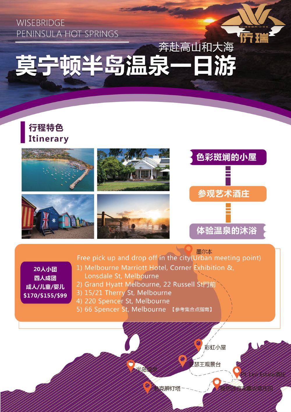 從墨爾本出發前往莫寧頓半島,墨爾本市區免費接送,接送行程順序可能前後調整。景點活動