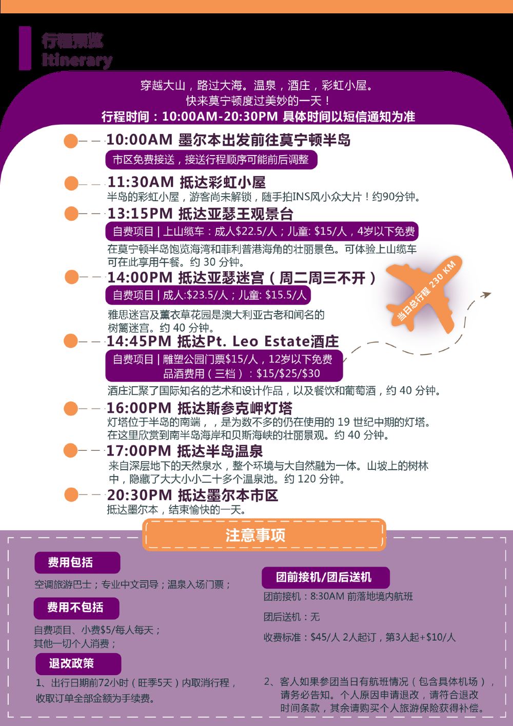 19:00 於墨爾本下車 指定區域以外不提供接送服務 墨爾本市區郵編3000免費接送*下單請務必提供您的詳細酒店信息,以便地接確認是否在免費接送範圍內;若超範圍,請前往最近的上/下車地點等候上車。