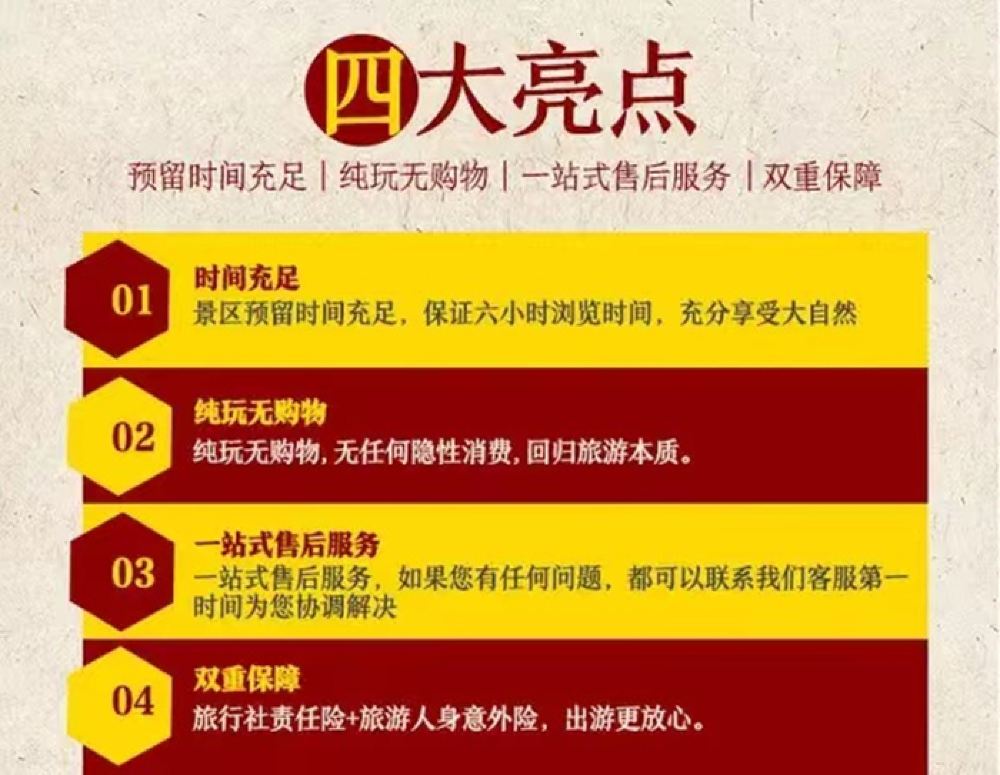 具體地點時間已導遊出發前一天20點前通知為準 具體時間地點以導遊通知為準! 溫馨提示:行程僅供參考,導遊有權調整行程遊覽的先後順序及時間安排,以當日實際行程和時間為準,如遇節假日會有堵車排隊晚點等不可抗力因素,敬請諒解