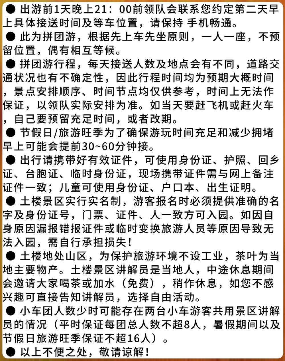 ●車輛會按原路返回,接送地點與出發地點相同。視當日道路交通狀況,送達時間可能會晚於預期,無法準確預估,敬請知悉! ●以上行程時間、順序僅供參考,領隊會根據當天實際情況對景區遊玩時間、順序作出相應調整,時間有可能提前或延後,以當天領隊實際安排為準。 ●來回景區途中,領隊會講解當地人文故事、風土人情、特產以及吃喝玩樂等資訊,如不感興趣可直接向領隊反映。