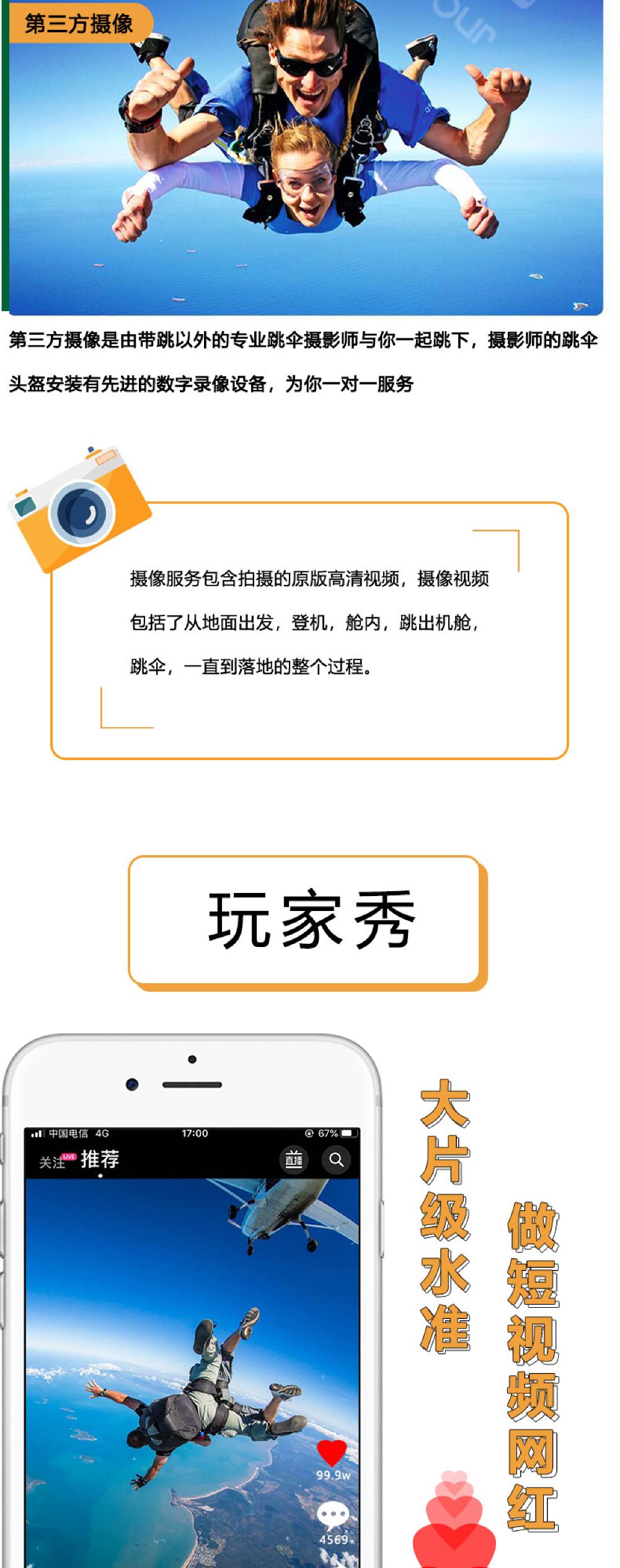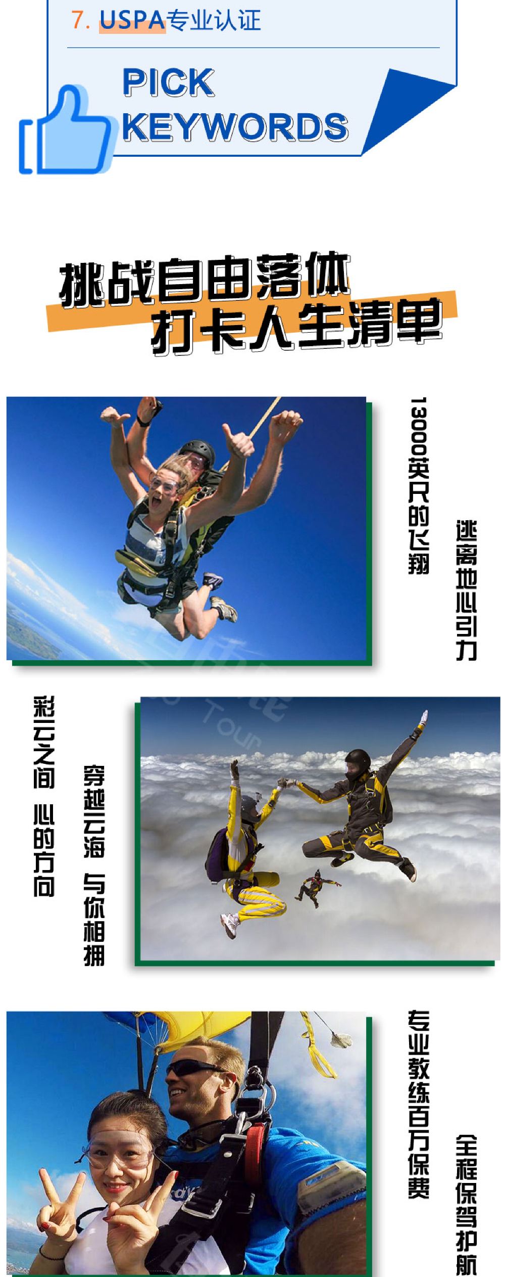 8. 考慮到安全因素,USPA不允許任何200跳以下的個人在跳傘活動中使用照相或攝像設備。但是您可以在地面進行準備登機前的拍照,如果您希望拍攝跳傘時的畫面,我們提供專業的攝影師可以和您一同跳傘,幫您記錄下難忘瞬間;