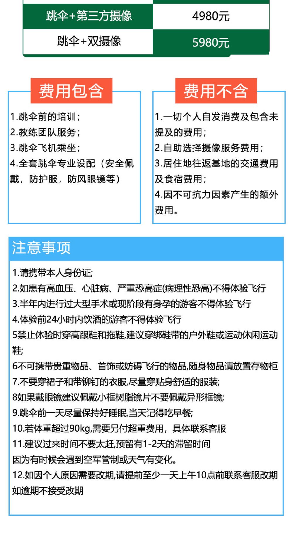 6. 建議跳傘前的晚上不要大量飲酒,跳傘前不要吃太飽,潛水後24小時以內不允許跳傘。孕婦、有心腦病史、嚴重高血壓患者及其他特殊旅客不能參加跳傘活動,過程中如有身體不適需及時向教練反應;