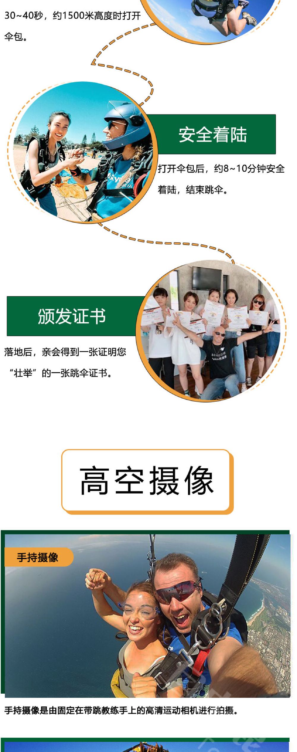 2. 整個跳傘活動,包括從當地酒店來回跳傘基地的乘車時間,包括空管和天氣等不可抗力因素建議預留1~2天時間體驗;