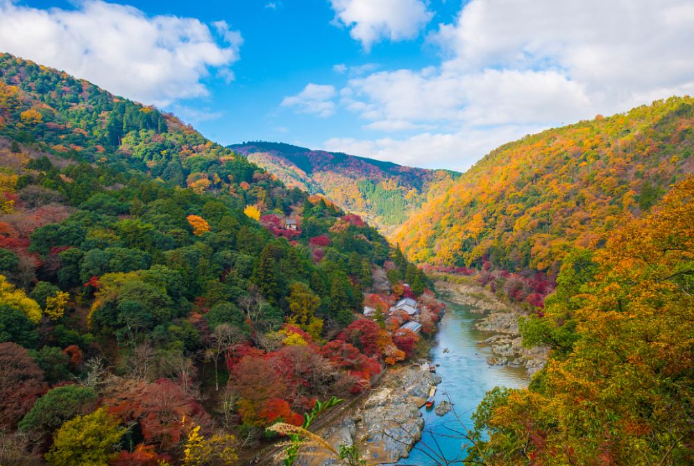【嵐山位於京都的西北地區,其世界聞名的竹林和隨季節變化的美麗風景吸引了眾多遊客。該地區散佈著寺廟、古老的皇家別墅和著名的歷史古蹟,其中許多都屬於國寶級,甚至是公認的世界遺產。整個地區都已被指定為風景名勝區。