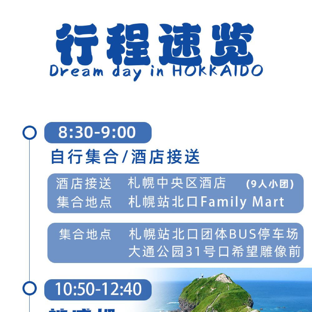 B-9人小團丨自行集合:札幌站 | 中型巴士(10座) | 普通話 | 於集合地點集合 | 拼團 | 9位旅客 | 司機及遊覽講解 | 不包括餐膳 | 回程於指定地點解散