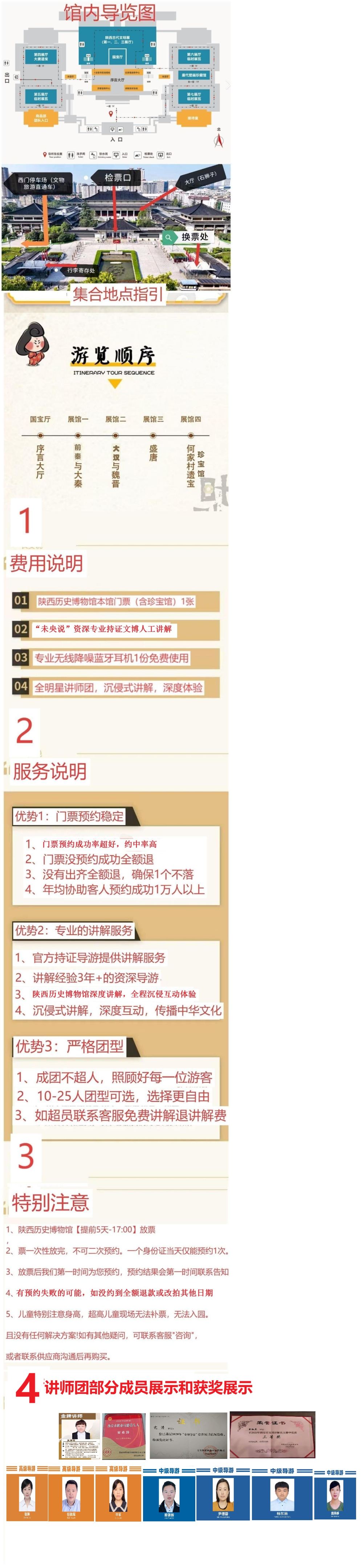 1、出發前5天晚上21點回饋門票預約結果,預約成功的會以短訊通知,請客人注意查收。 2、門票預約成功的客人,出行前一晚21點前講解老師會與您聯繫,告知講解開始的具體時間及注意事項(如22點仍未收到聯繫,請及時聯絡線上客戶服務支援)。 3、陝歷博更改入館規則,需嚴格按照時間入館,上午8:30或10:30隨機場次,集合或講解時間約為10:00左右,具體安排以老師通知為準。景點活動