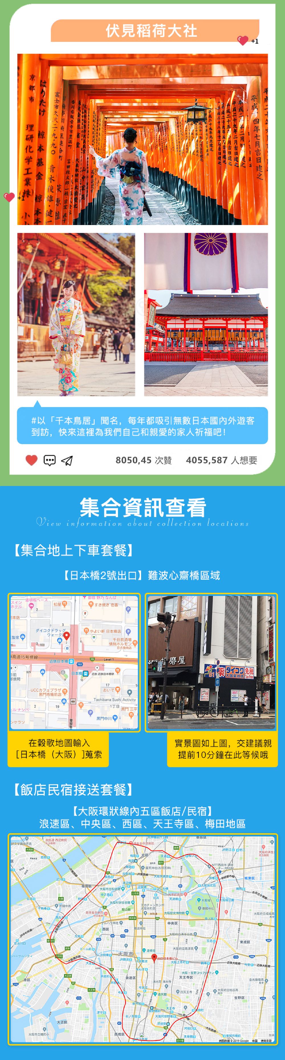 在集合地點集合09:00 大阪 大阪或京都市區內酒店/民宿均可上門接送,上午7~11:00均可上門接,您可自行決定上門時間。如需其他區域接送,可諮詢客戶服務支援重新報價 集合