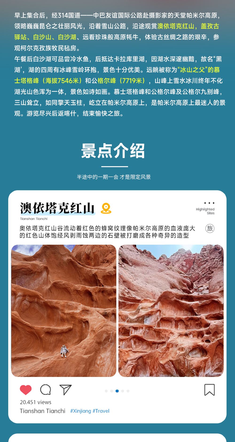 【遊覽特色】慕士塔格峯、崑崙山脈,是西崑崙山脈第三高峰。慕士塔格峯、公格爾峯、公格爾九別峯,三山聳立,如同擎天玉柱,屹立在美麗的帕米爾高原上,成為帕米爾高原的標誌和代表