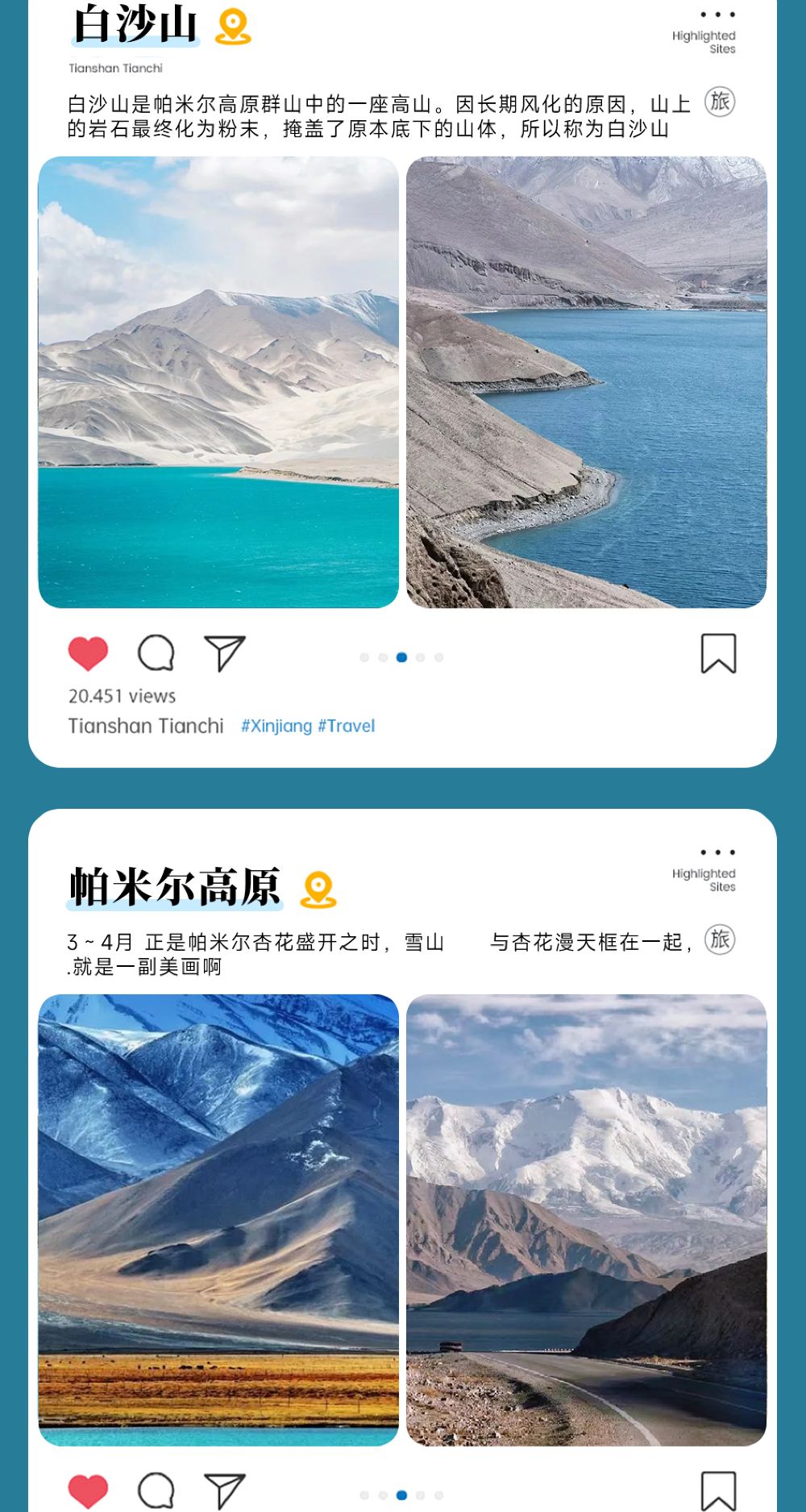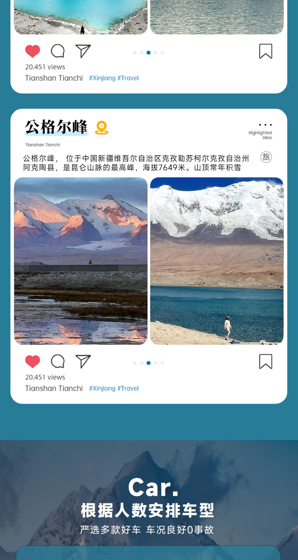 車輛行駛於山道,看著白沙漸漸退去,雪峰逐漸顯現;駛過彎道,驚見湖水由青變藍;憑窗抓拍,感受兩湖光影交替的奇幻與壯美。景點活動