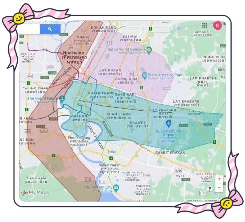 【接送範圍】:綠色區域為免費接送範圍,其他兩個顏色區域超出接送範圍,需支付200銖的超區費用,詳情請聯絡客戶服務支援查詢