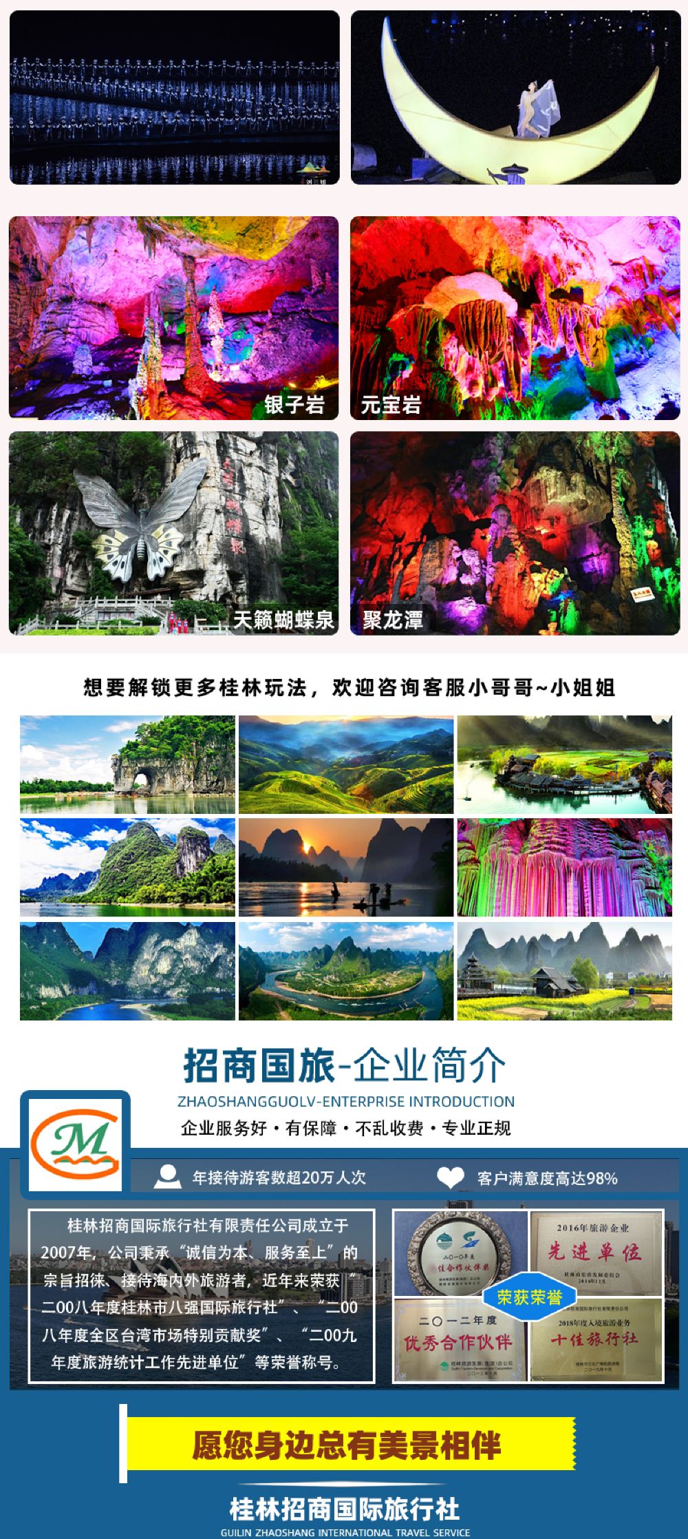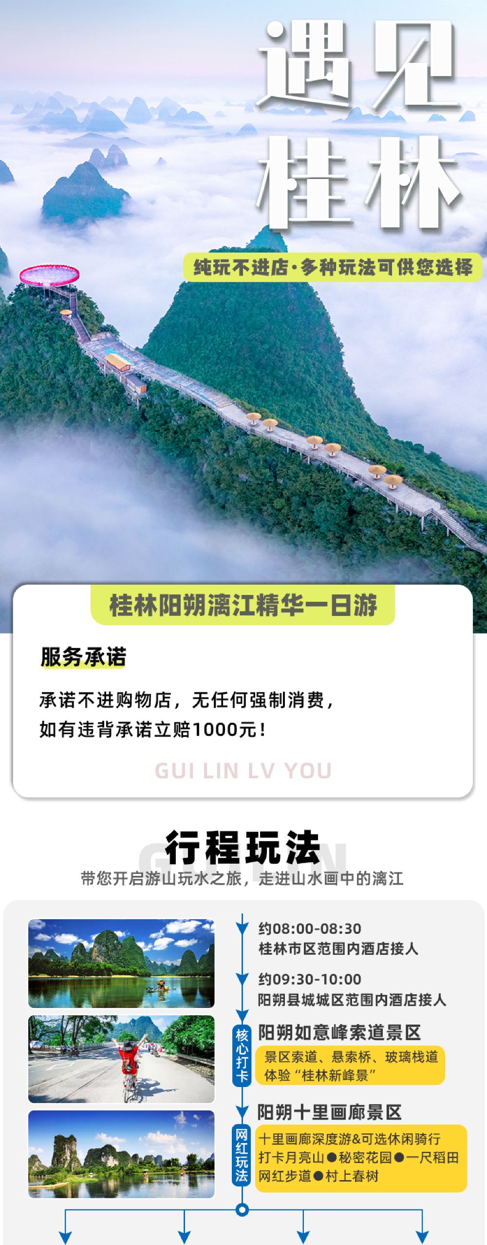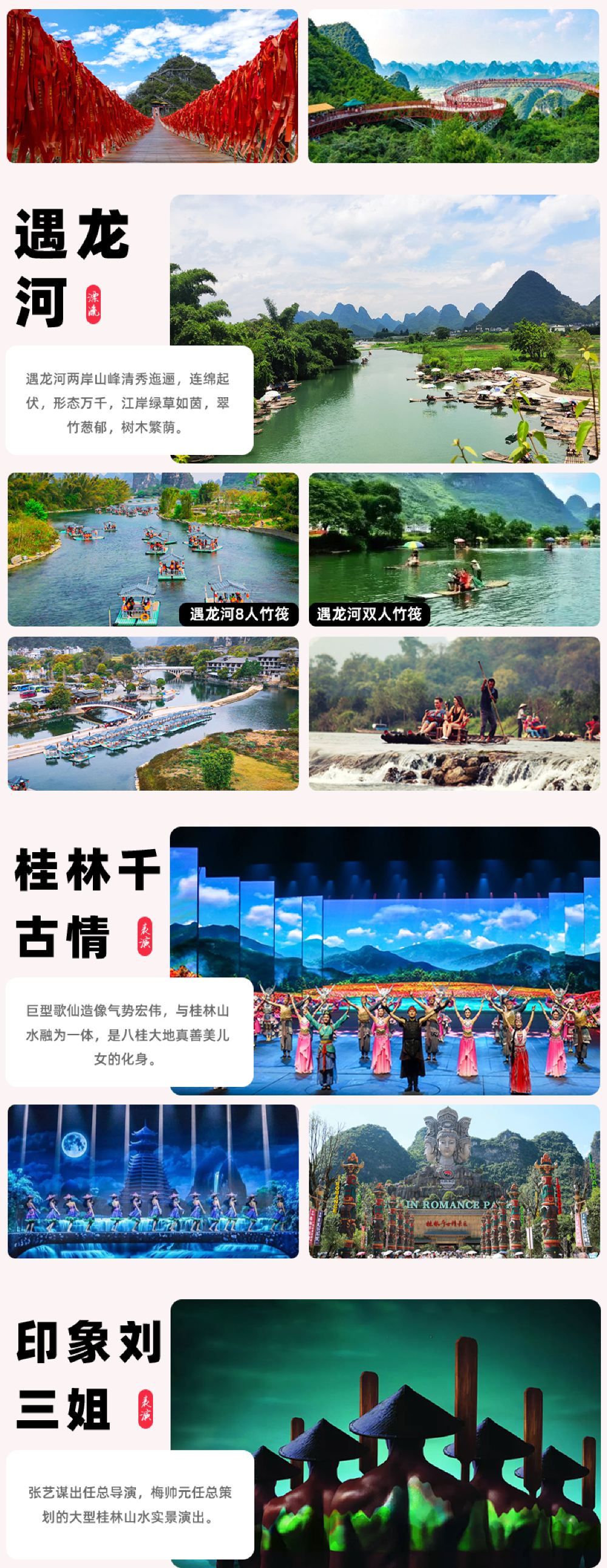 - 【多景點搭配】如意峰索道・深度十里畫廊・休閒騎行・可選搭配遇龍河人工竹筏/桂林千古情/《印象劉三姐》山水實景演出。