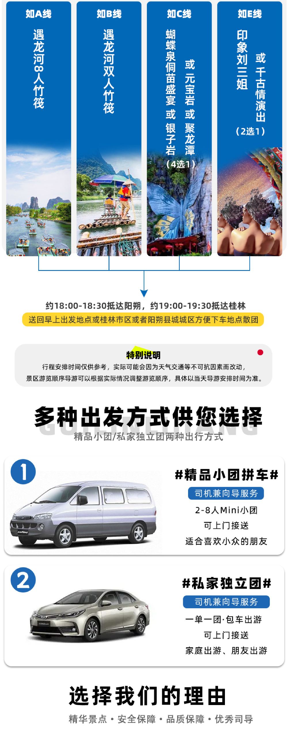 2、精品小拼團:真正的小型拼團,每車不超過8人,如有單個家庭團體超過8人,將直接升級為私家獨立團(根據人數安排車輛接待);