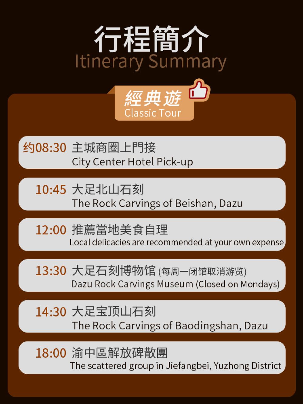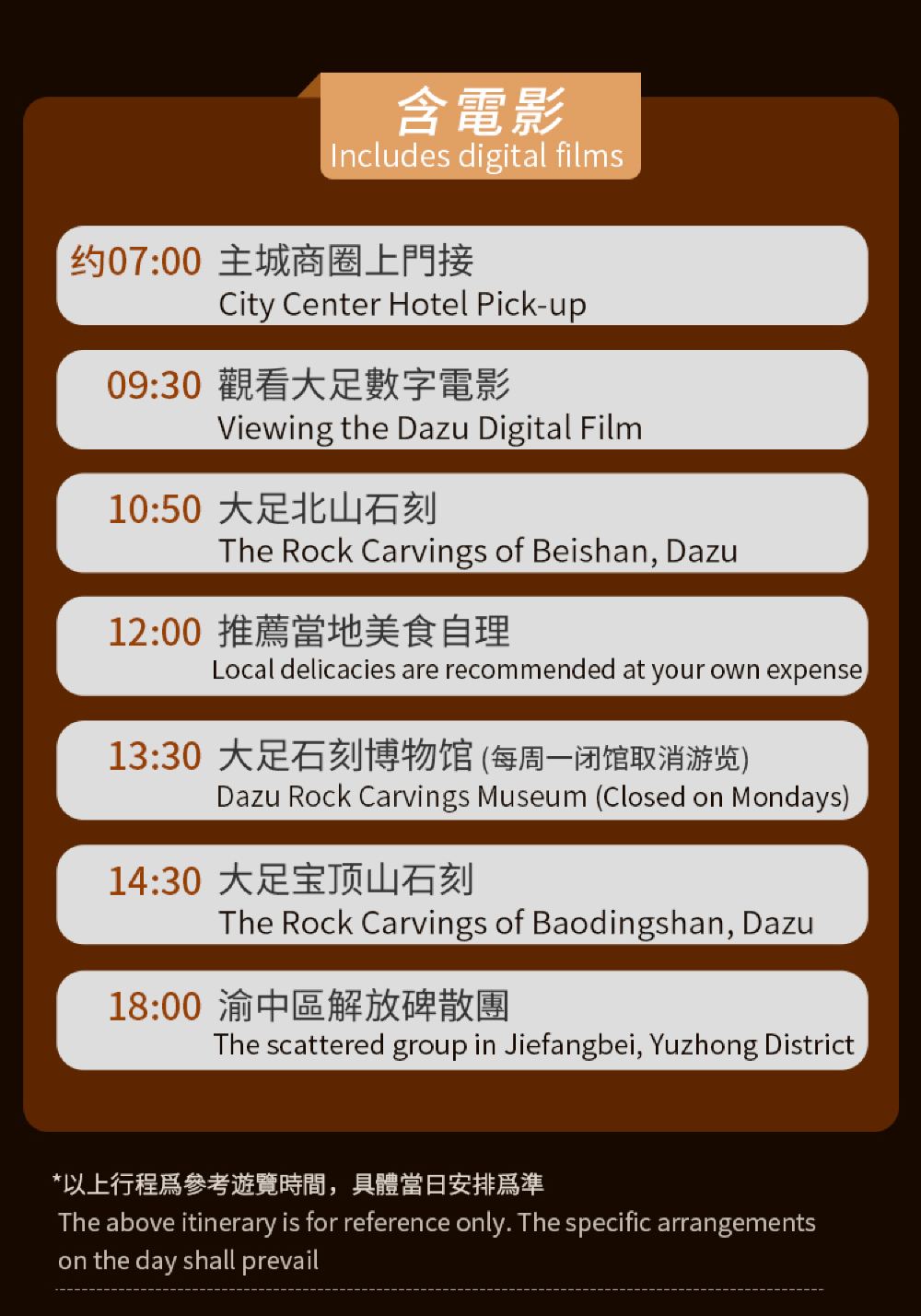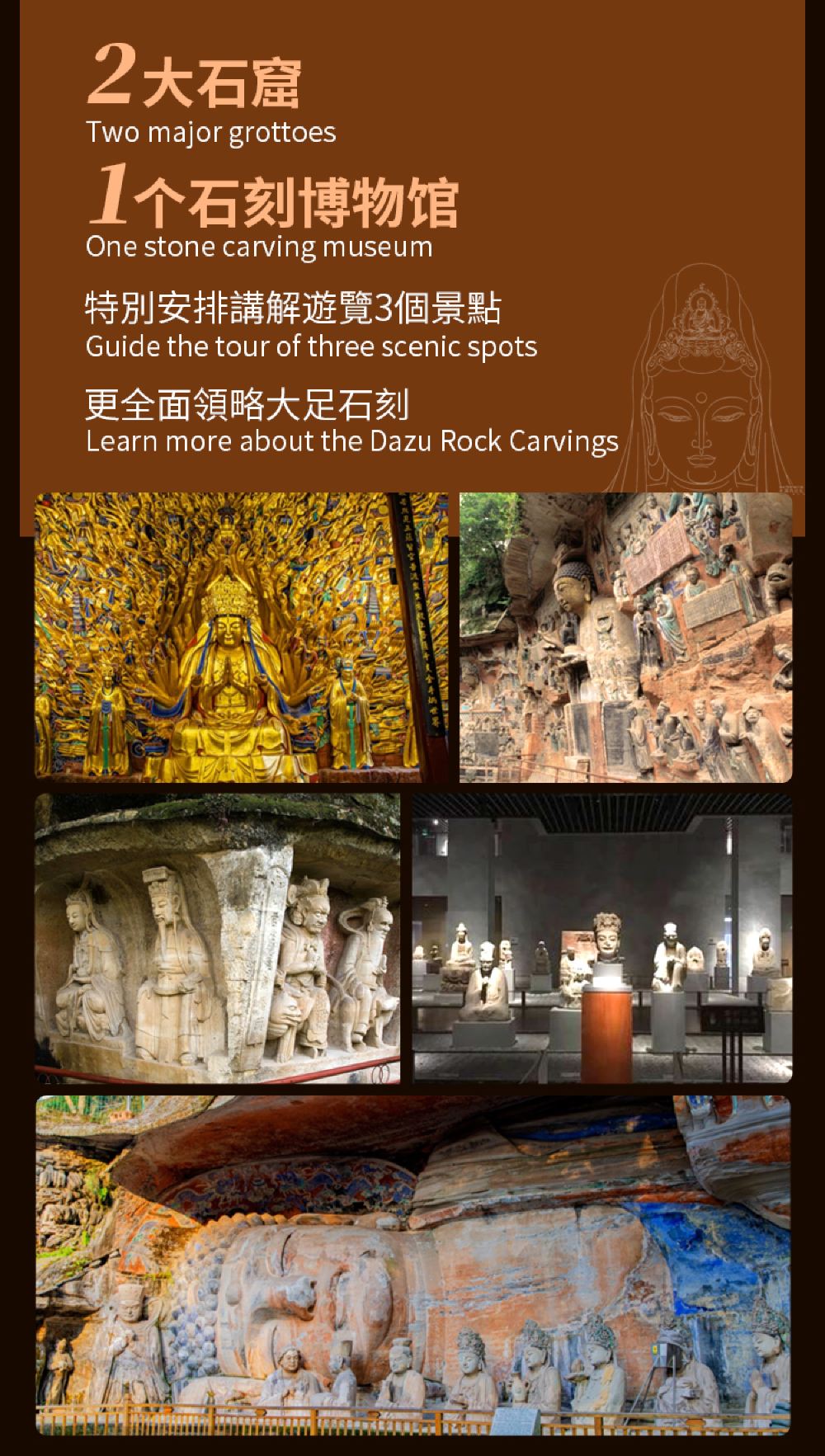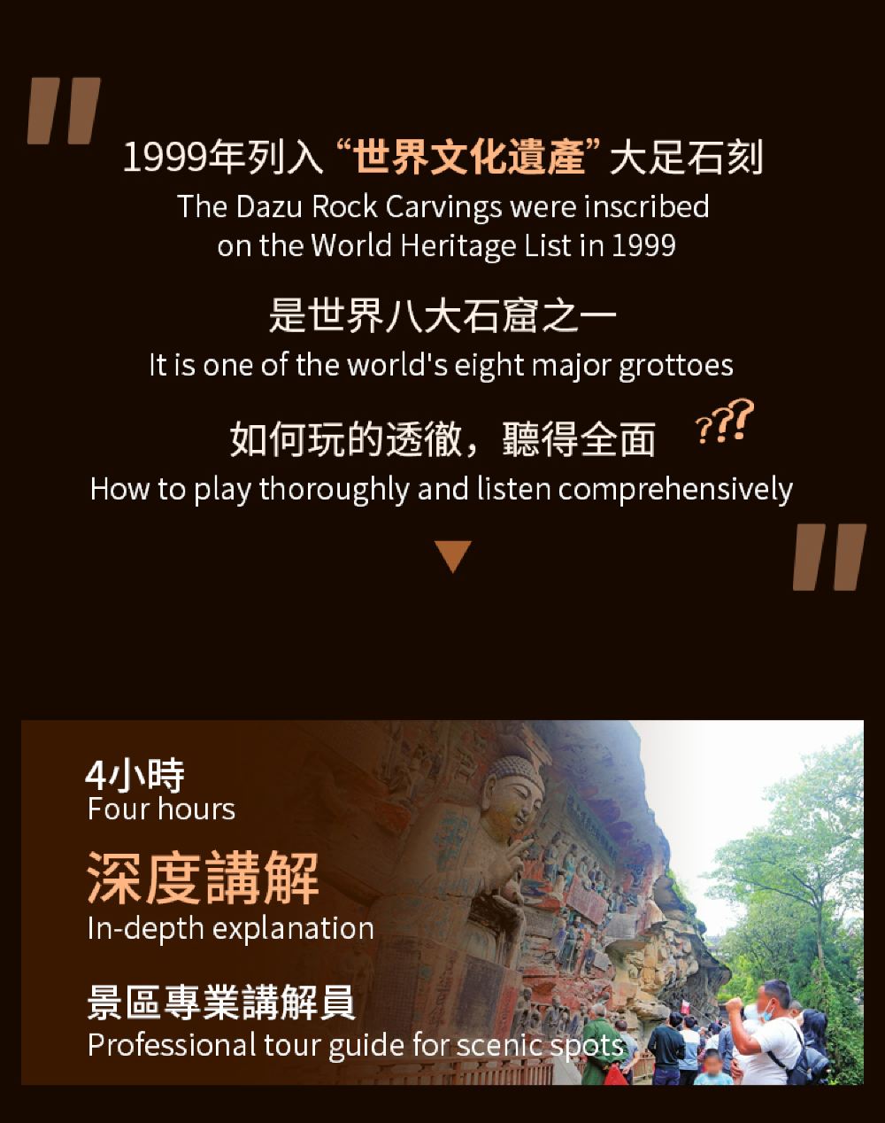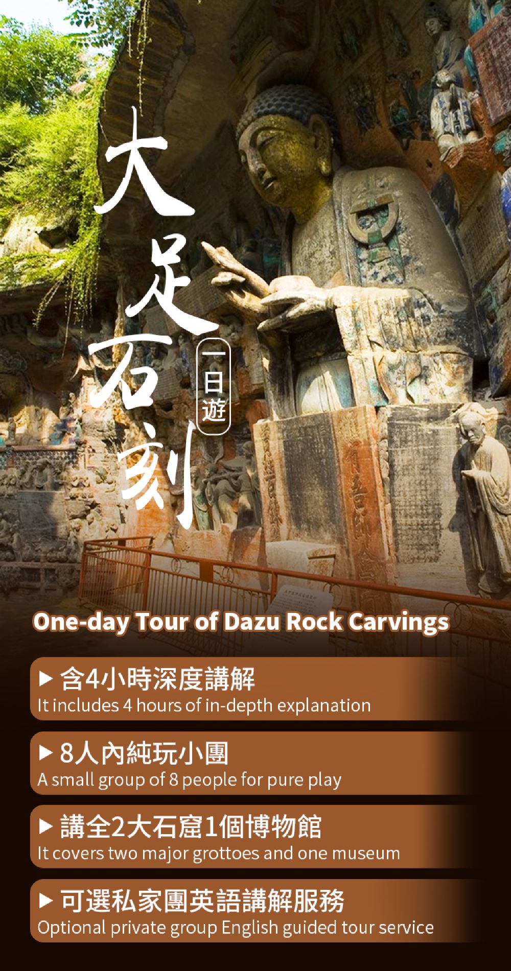 大足石刻主要景點:寶頂山、北山、大足博物館,為了更深入了解,我們特別安排金牌講解員講解全3大景點景點活動