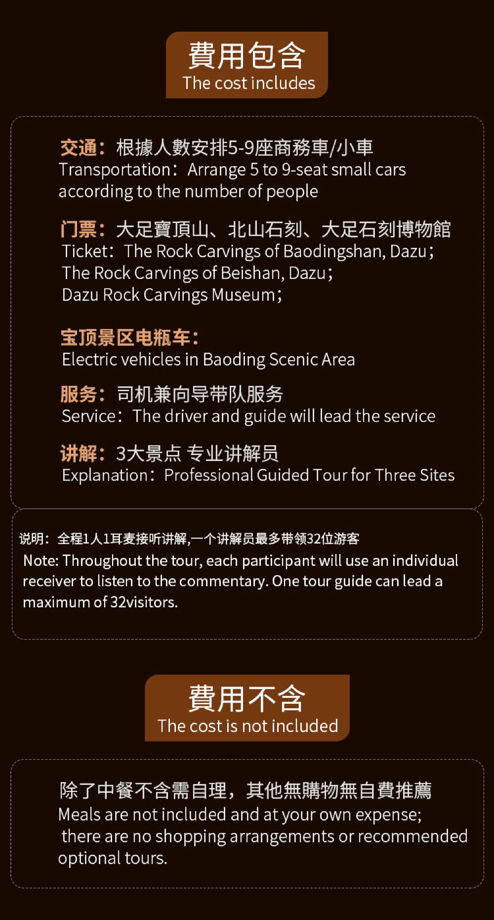 D-3人包車+英語導遊全程講解 | 經濟型7座 | 英文 | 提供去程接送 | 獨立包團 | 3位旅客 | 普通導遊 | 不包括餐膳 | 回程於指定地點解散 | 大足石刻·遊玩項目-大足石刻(景區)/北山石刻/大足石刻博物館/寶頂山交通(旅遊巴士/觀光車)