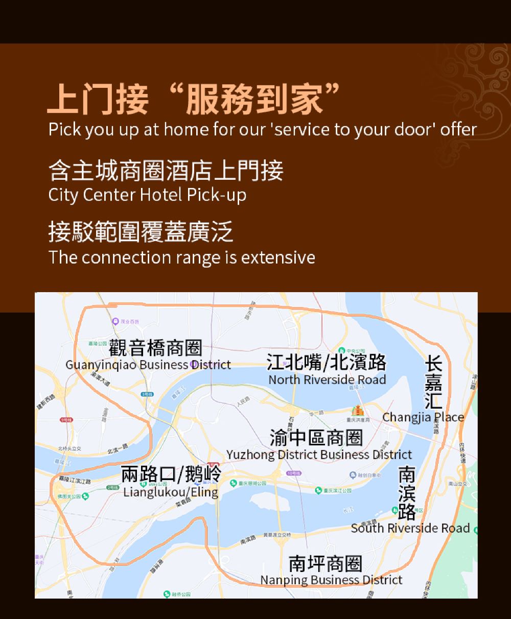 於指定地點接載07:00 重慶 於指定地點接載 一、上門接載範圍:解放碑、洪崖洞、朝天門、觀音橋、南坪步行街、北濱路、南濱路等區域; 二、下單後,出發前一晚22點前司機會致電給您,確認上車地點及時間【節假日或旺季期間會提前出發】