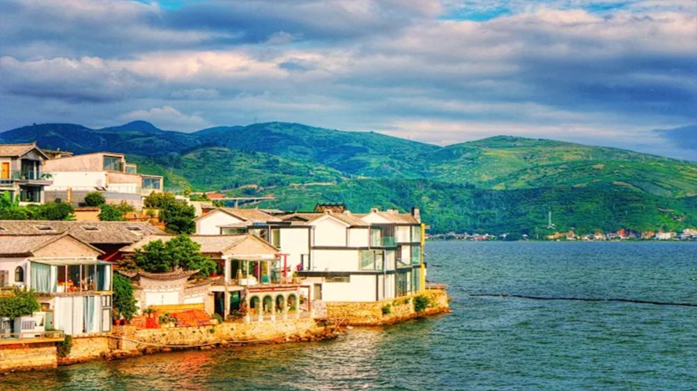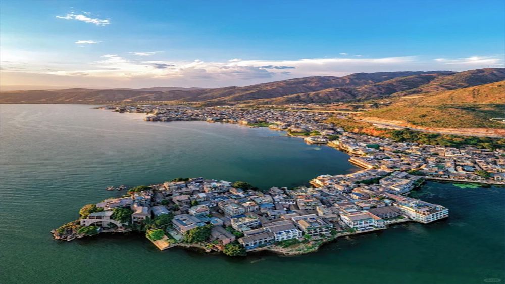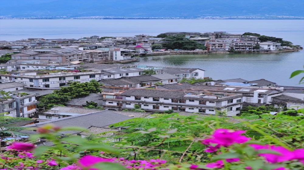▲ 在雙廊,放眼望去,秀麗的玉幾島、小金梭島猶如一對鴛鴦,浮在碧綠的洱海之中,兩島位於兩廊之間的麗玲峰下,清咸豐年間,人們認為「二島」、「二曲」皆為「雙」,所以將「拴廊」改為「雙廊」。雙廊風光以背負青山,面迎洱海、緊連雞足、遠眺蒼山而獨秀。既有漁田之利,舟楫之便,更擁有「風、花、雪、月」之妙景,享有「蒼洱風光在雙廊」的美譽,登上南詔風情島,更可目睹17米高的漢白玉觀音拜彌勒佛山的奇觀。