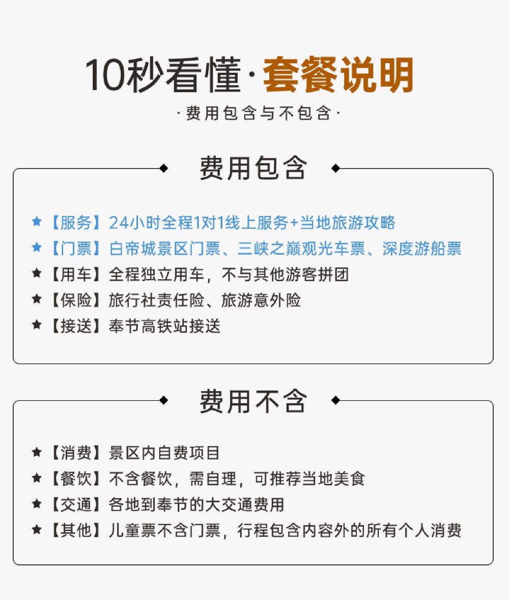 2.需自行購買重慶-奉節來回高鐵票,為確保遊玩時間,建議於9:00前抵達奉節站,回程高鐵票建議購買18:00後的車次;10:00前的車次亦可接載,但回程建議購買19:00後的車次。