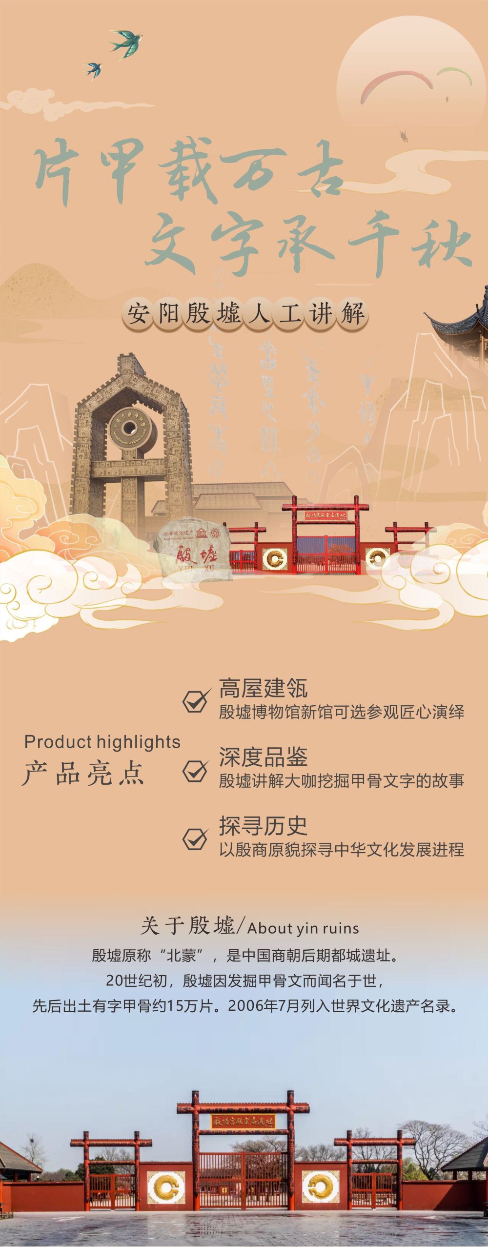 在集合地點集合18:00 安陽 殷墟博物館 集合 1、場次參考:09:00/14:00(場次會根據客流量進行調整,實際出行場次以和客戶服務支援約定為準)。 2、拼團講解按人收費,幾人出行買幾份;包團講解1-5人使用,不含門票,超出人數需要另外付費。 3、不含門票。