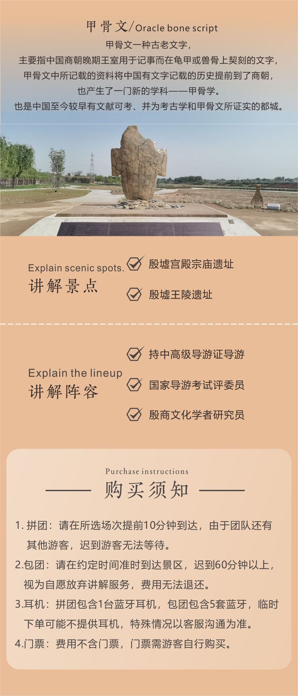 在集合地點集合12:01 安陽 殷墟博物館 集合 1、場次參考:09:00/14:00(場次會根據客流量進行調整,實際出行場次以和客戶服務支援約定為準)。 2、拼團講解按人收費,幾人出行買幾份;包團講解1-5人使用,不含門票,超出人數需要另外付費。 3、不含門票。