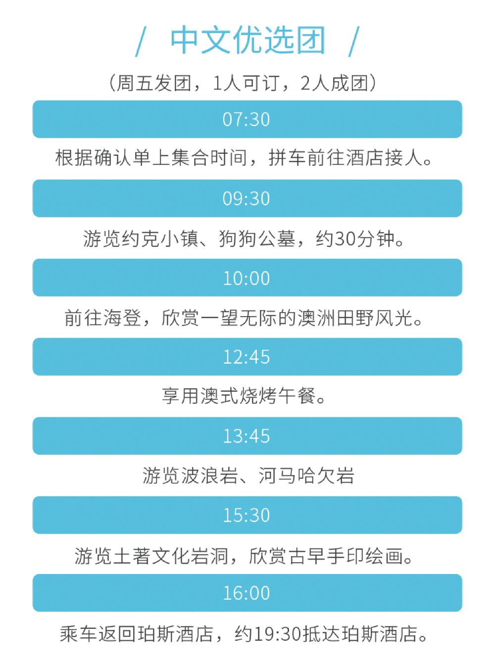 1. 成團說明:中文一日遊行程每週五出發,1人起訂,2人成團;波浪巖一日遊行程週六日出發,1人起訂,7人成團。如未達到成團人數,將提前1日聯絡您。