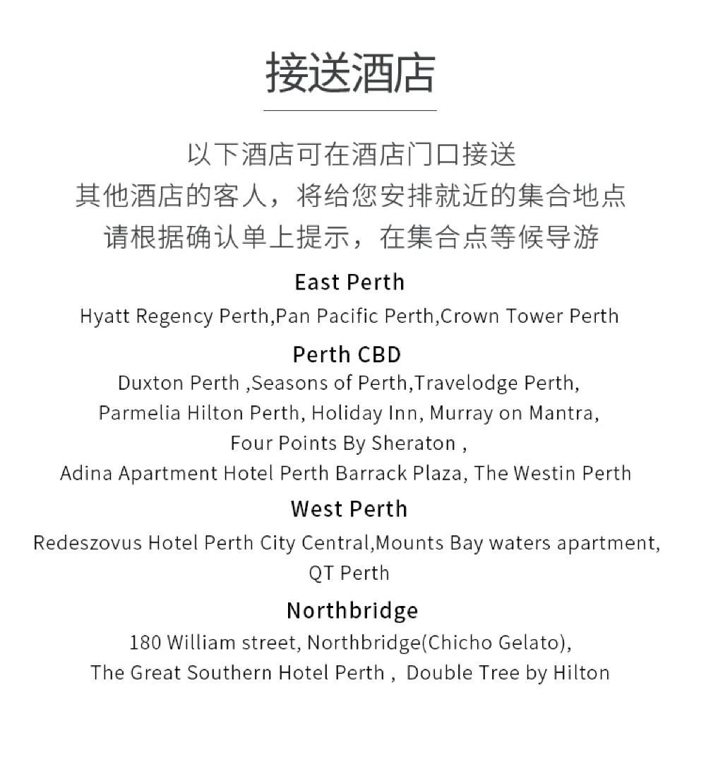 3.中文一日遊提供珀斯市區大部分酒店接送,但少數酒店位置偏遠,或不方便停車,活動公司將安排就近的會面地點,請您按照收到的電子確認單上的集合時間和地點為準。