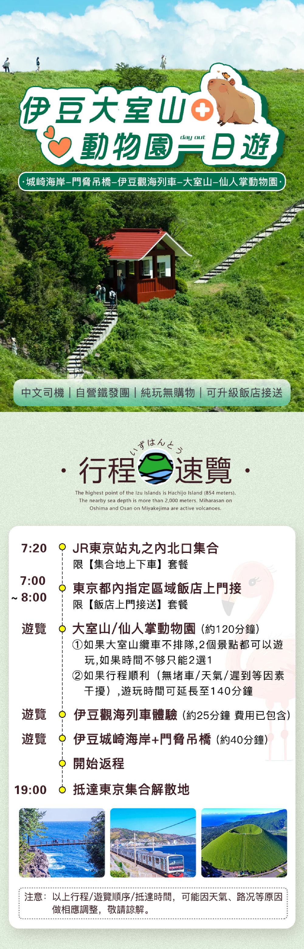 東京伊豆大室山+仙人掌動物園+城崎海岸+門脅吊橋+觀海列車一日遊【純玩9人小團|贈觀海列車票|酒店上門接送可選|中文司導】