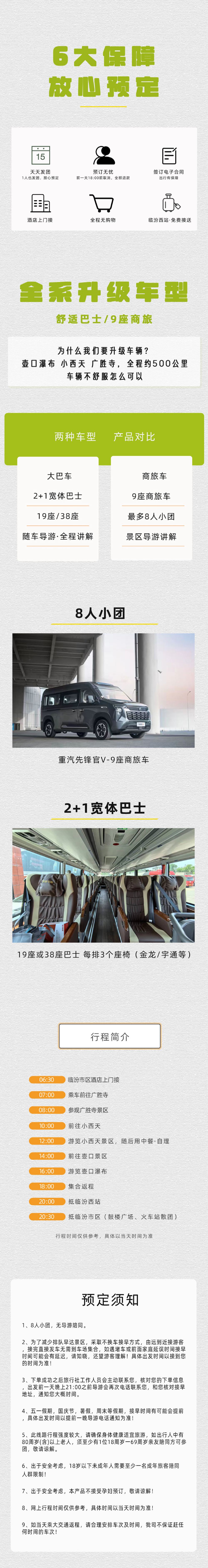 註:小西天壺口景區60周歲以上免門票,廣勝寺65周歲以上免門票。60-65歲訂套餐A/E,自理廣勝寺午餐