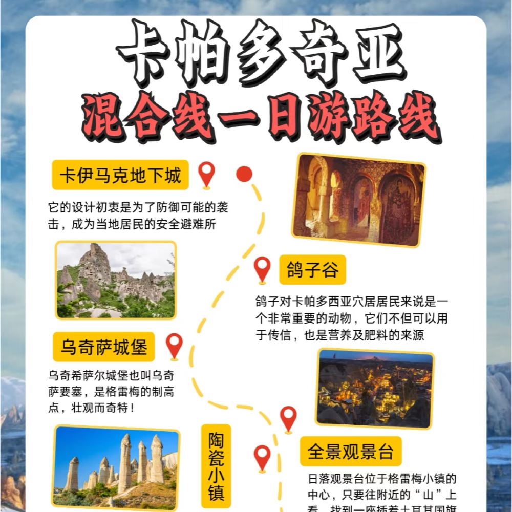 ▲ 外觀烏奇希薩爾城堡、鴿子谷打卡藍眼睛樹、阿瓦洛斯小鎮參觀陶藝工坊(可動手體驗製作過程)、帕夏貝仙人煙囱觀賞奇特蘑菇景觀、全景观景台觀賞喀斯特地貌、走進消失的露天博物館探訪真正的卡帕多奇亞