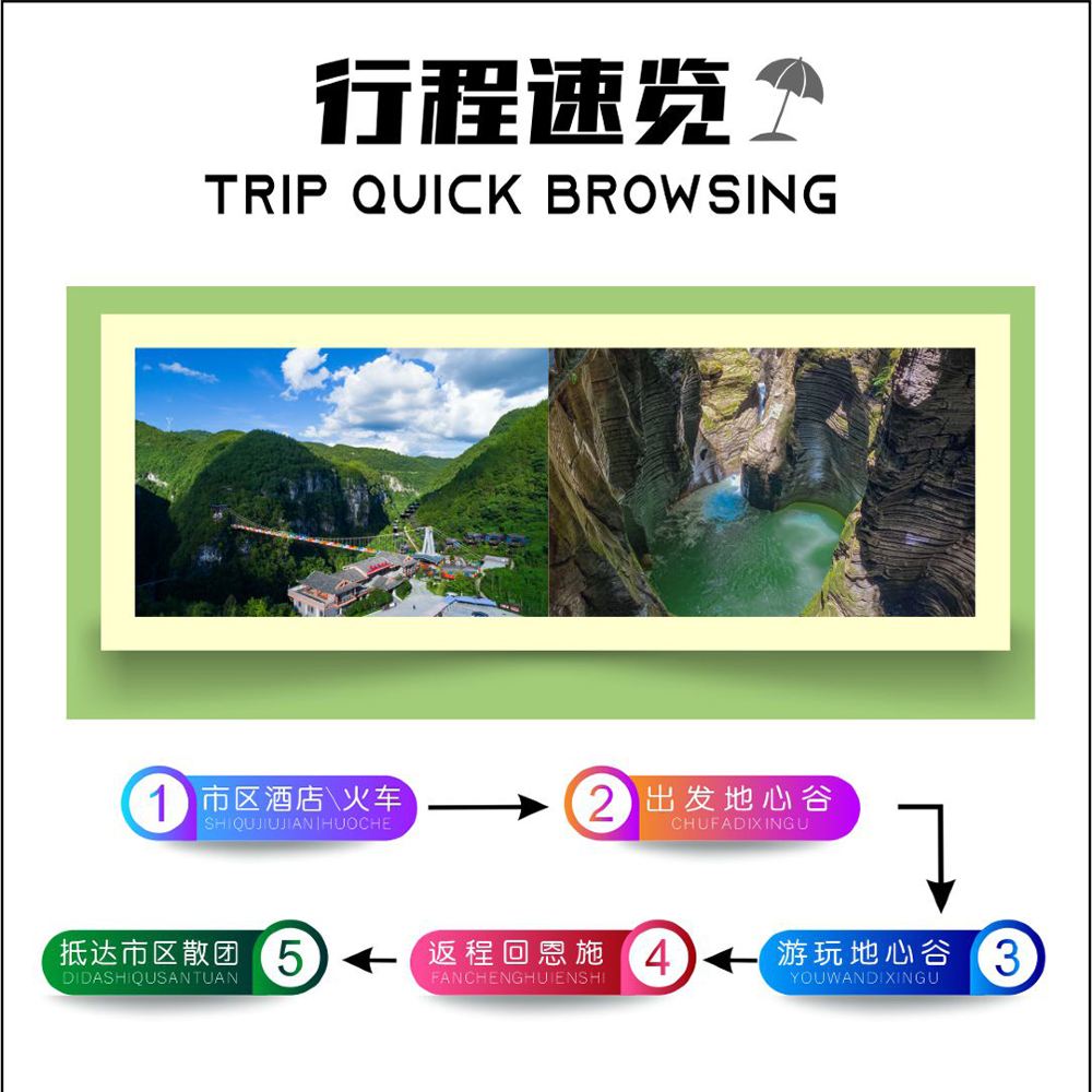 遊玩結束後,返回恩施市區,當天返程的貴賓可選擇地心谷15點後的返程車次【高坪站】;恩施站則可選擇17點後的車次在指定地點下車