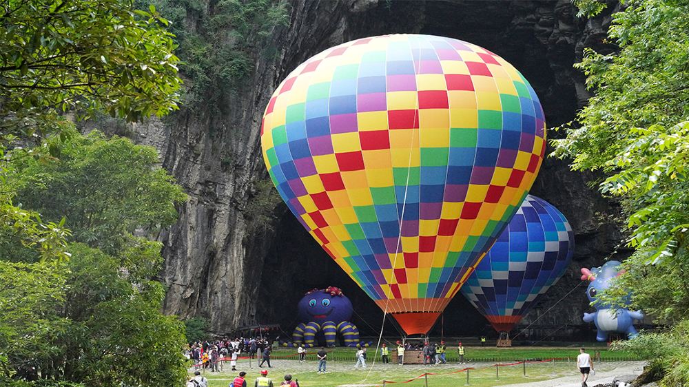▲ 騰龍洞全長59.8公里,洞口高72米,寬64米,可容納20多輛卡車並排行駛,直升機亦可自由進出,規模宏大。洞口左邊有原全國人大常委會副委員長王任重親筆題寫的「騰龍洞」洞名