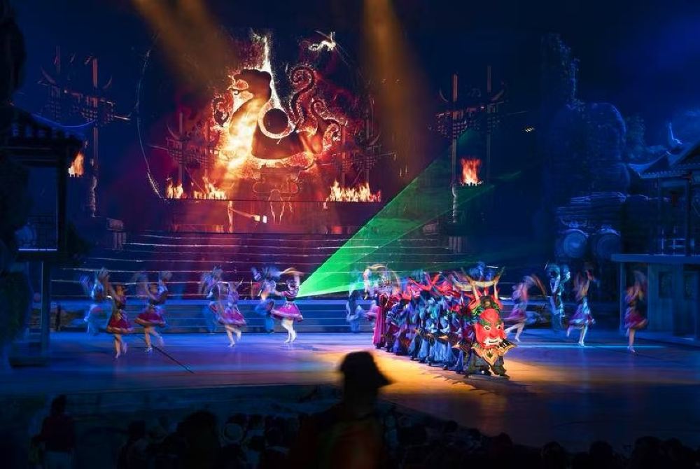 ▲ 洞穴劇場全景:天然穹頂作背景,舞台燈火璀璨,吊腳樓實景與演員同框,觀眾席座無虛席。白虎雄風篇章:宏大光影烘托巴人先祖故事,演員服飾華麗、動作剛勁。巴裔風情·傘舞:巨型紅傘配合群舞,燈光柔和,盡顯土家柔美風情。龍船古韻·月夜吊腳樓:月色燈光下,土家生活場景復刻,歌聲悠揚。