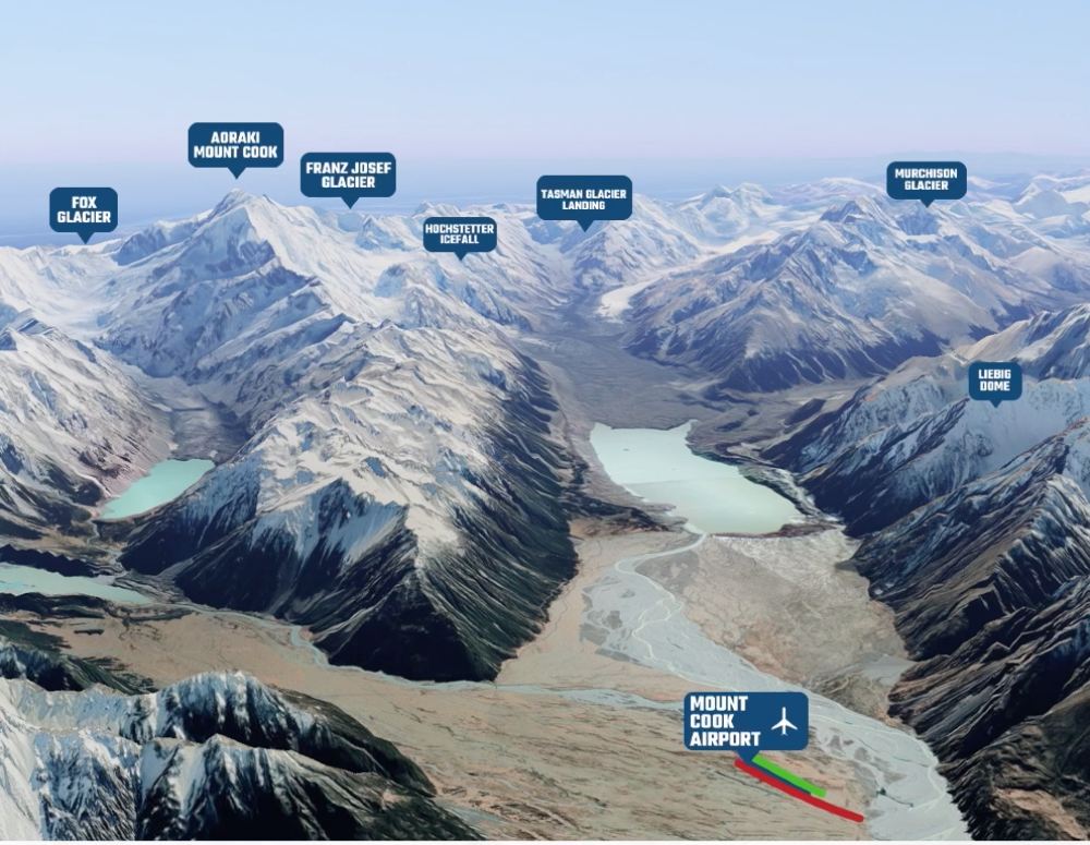 飛行過程中,您將欣賞到庫克山及其周圍的國家公園的美景。白雪皚皚的山脈,湛藍的冰川湖和鬱鬱蔥蔥的綠色植被。