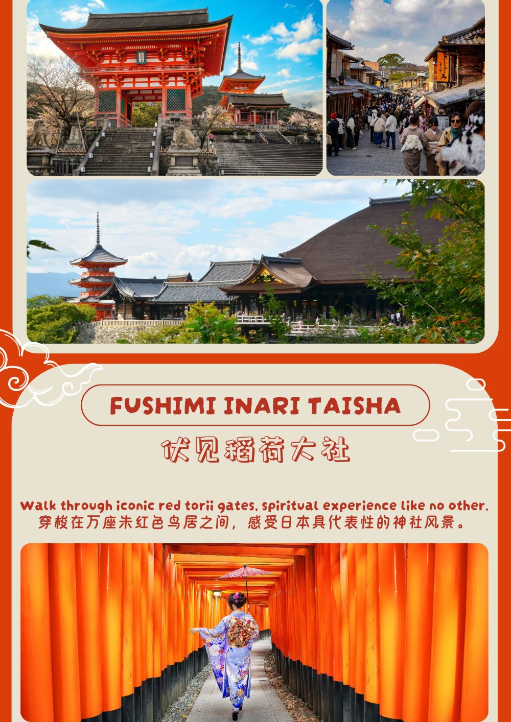 - 穿越千鳥居 | 走進伏見稻荷大社,步入千本紅色鳥居,蜿蜒小徑通往山林深處,沉浸獨特神社文化的神秘感。
