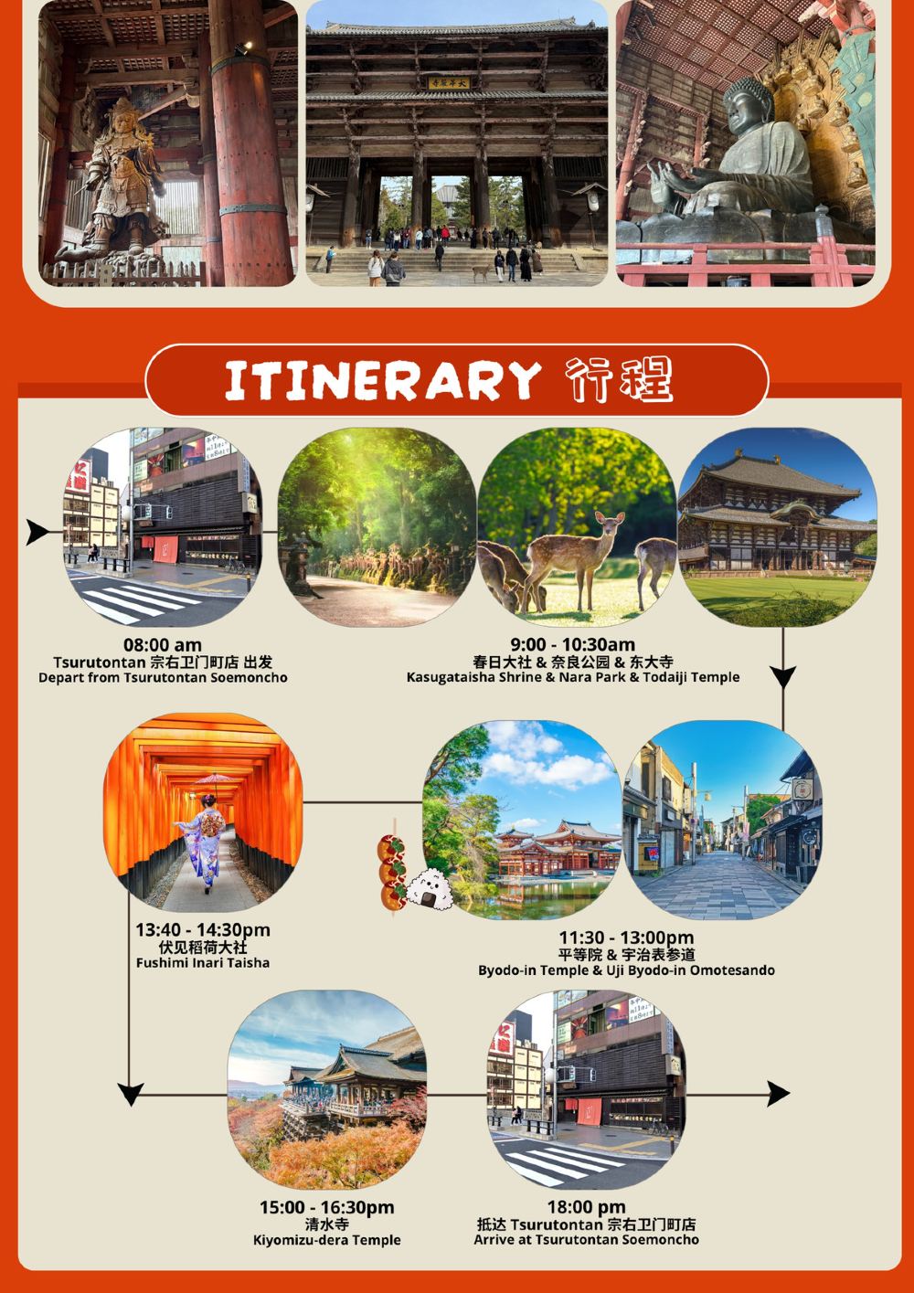 京都與奈良打卡熱點精華一日遊【大阪出發 • 探訪7大名勝 • 清水寺+伏见稻荷大社+平等院+宇治表参道+奈良公园+東大寺+春日大社】