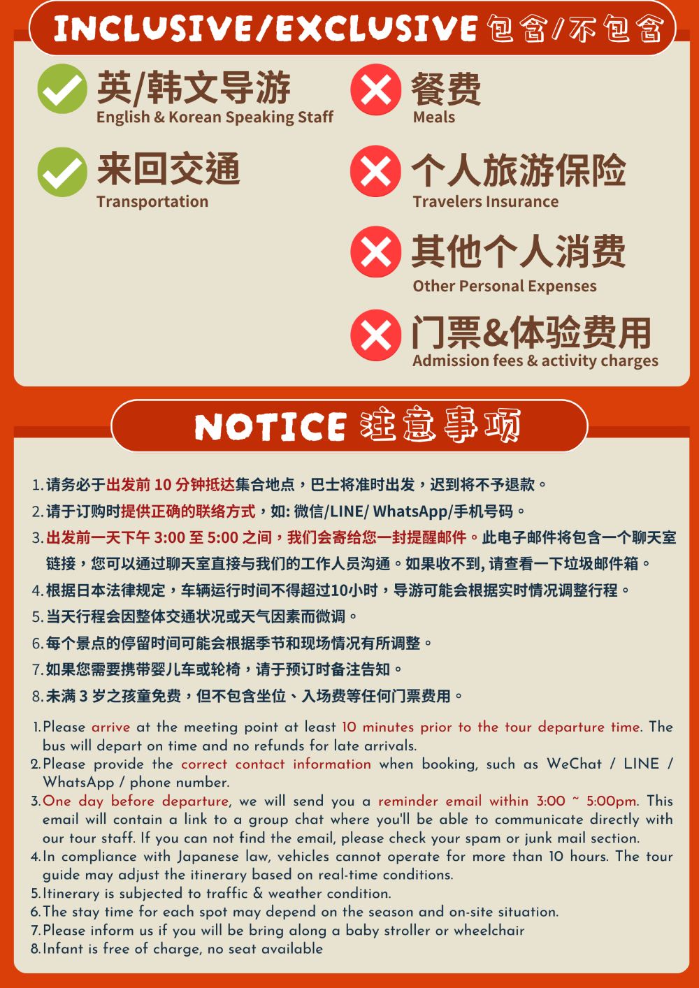 如需攜帶嬰兒車提前告知我們。嬰兒可免費同行但無座。